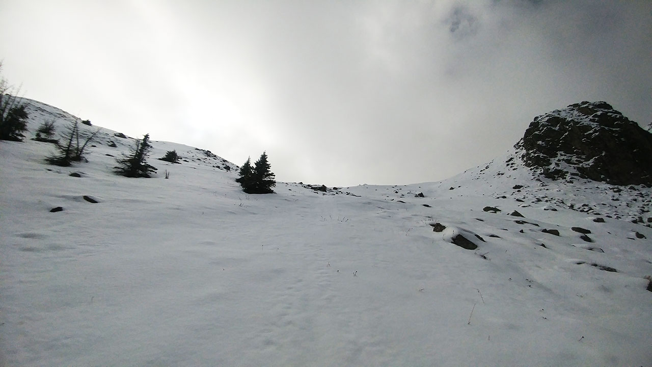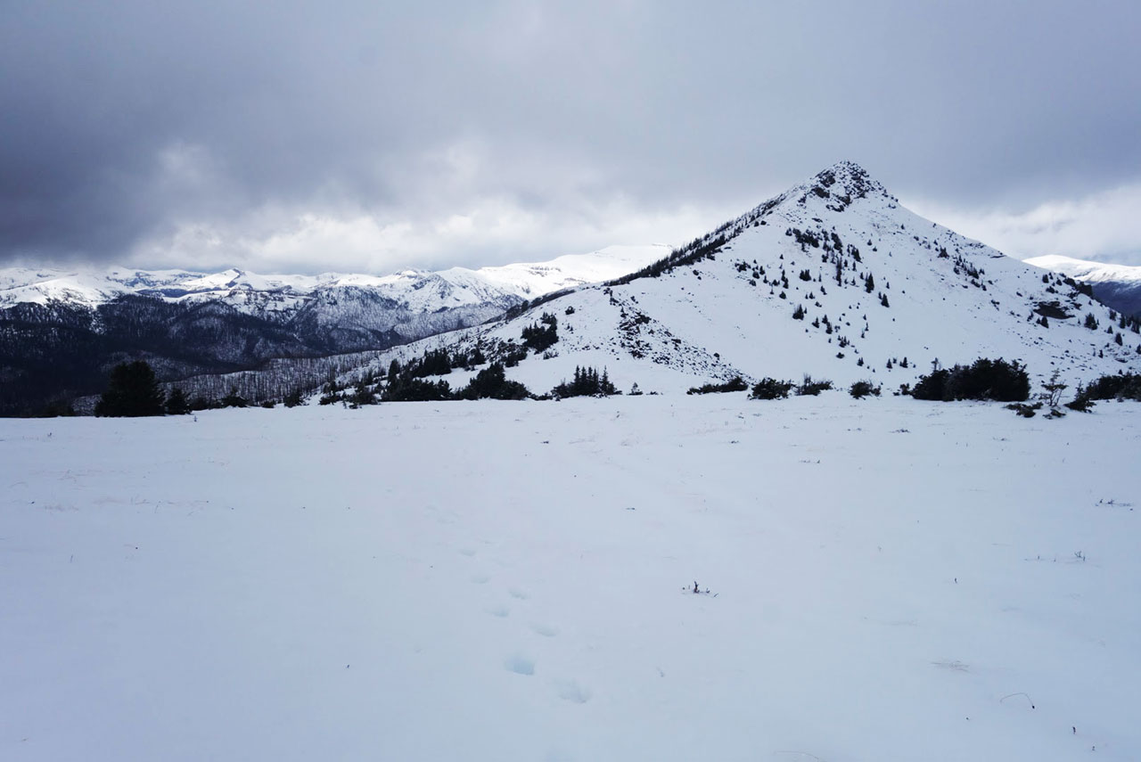 正午ごろに登りきりやっと稜線に出る。今日は朝の5時から歩いているので、もう7時間も活動していた。サンファン・ルートは30センチ程しか積雪しておらず、僕が心配していたよりも、ずっと少なくて安心する。その代わり、絶えず前後左右だけでなく上下からも強風が吹いていて、その凶暴さは猛獣の群れのど真ん中にいるようだった。