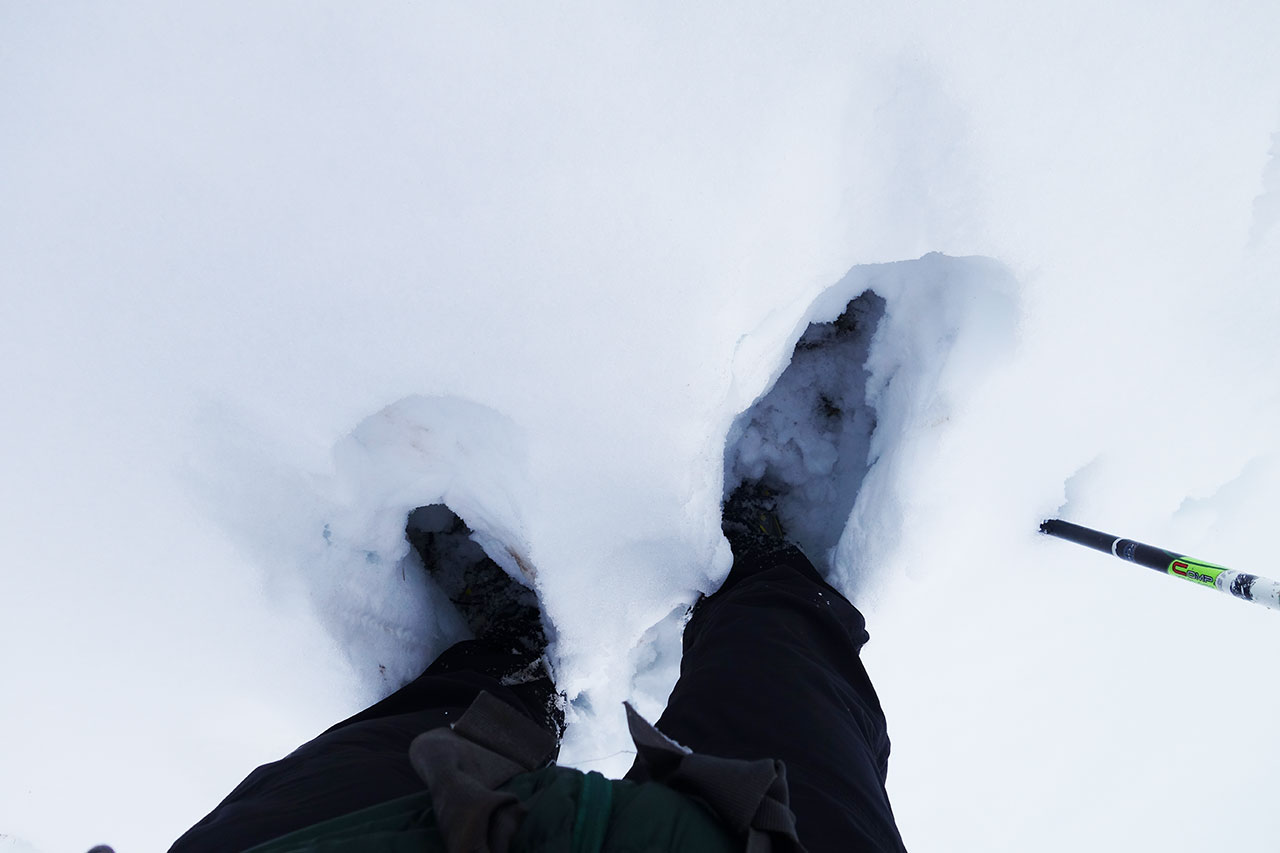 雪解け水がトレイルランニングシューズのメッシュ箇所から染み込み、指先の感覚まで凍らせる。白い息を吐いて急坂にしがみつくように歩いていた僕は、ふと足を止め、斜面に背を向けると、バックパックを背負ったまま勢いよく尻をついた。腰は完全に埋まり、雪が苦しそうにギュッと音を立てる。