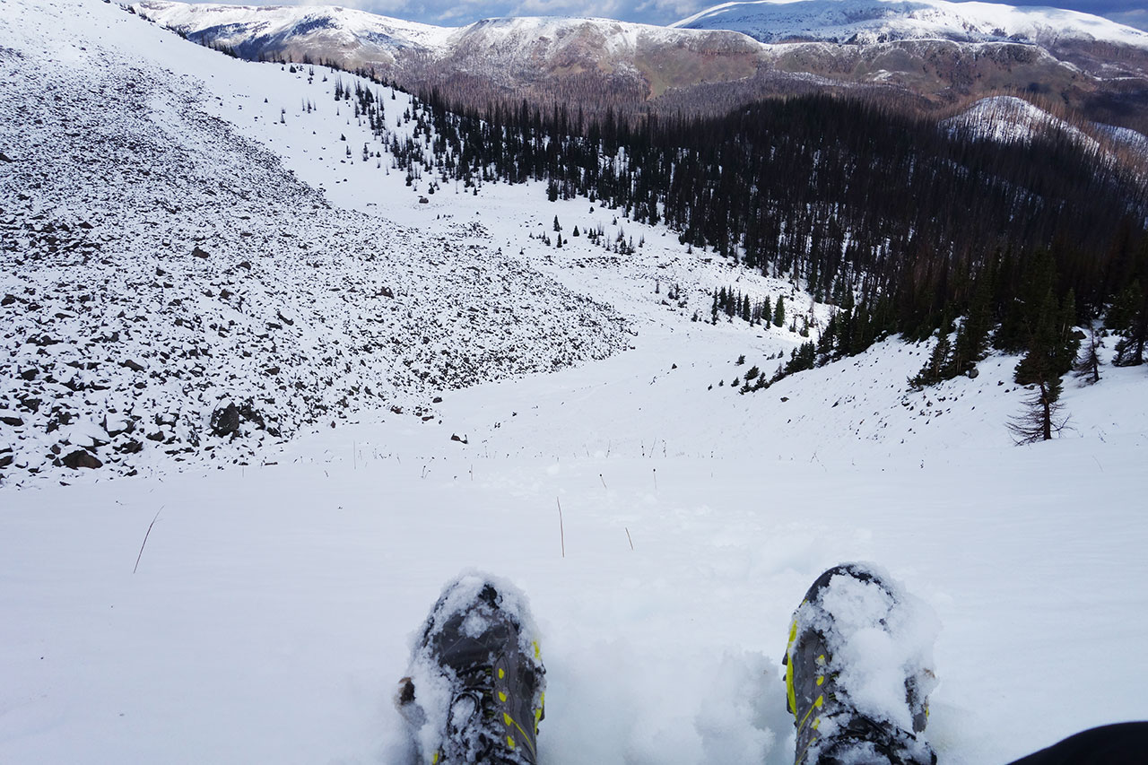 稜線から降る斜面の序盤は雪がクッションとなり、さほど苦労することもなく進むことができた。しかし、次第に雪が薄くなり、不安定なガレ場が現れはじめると、歩くのが困難になってきた。ぬれた岩は滑りやすく、岩を踏み抜くたびに鋭い岩が僕の足を削る。