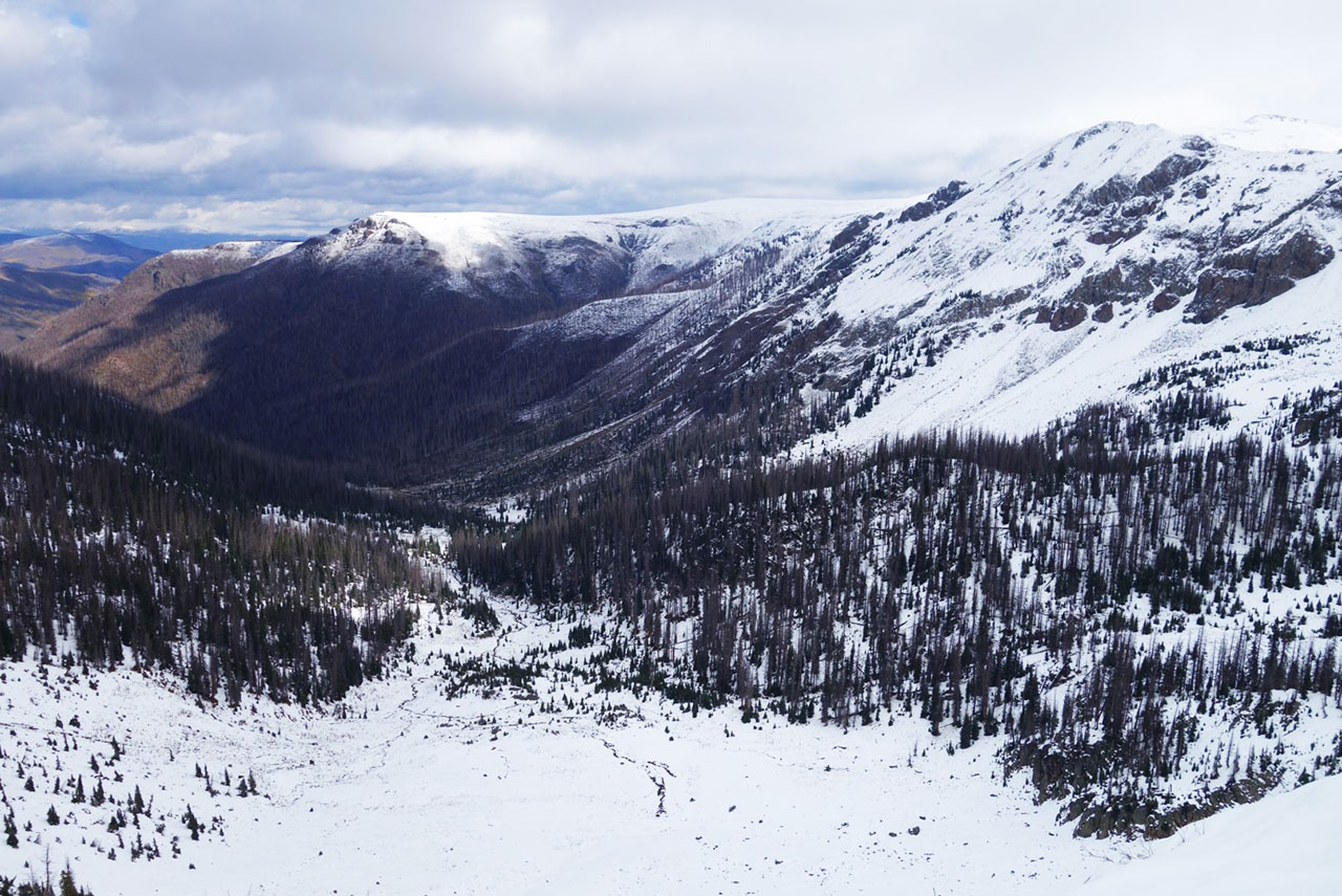 谷間を縫って伸びるクリード・ルートから、標高4000メートル級の稜線へ駆け上がるトレイルには、真っ白な雪の絨毯が敷かれていて、その上を1本の足跡がコーヒーの染みのように続いている。