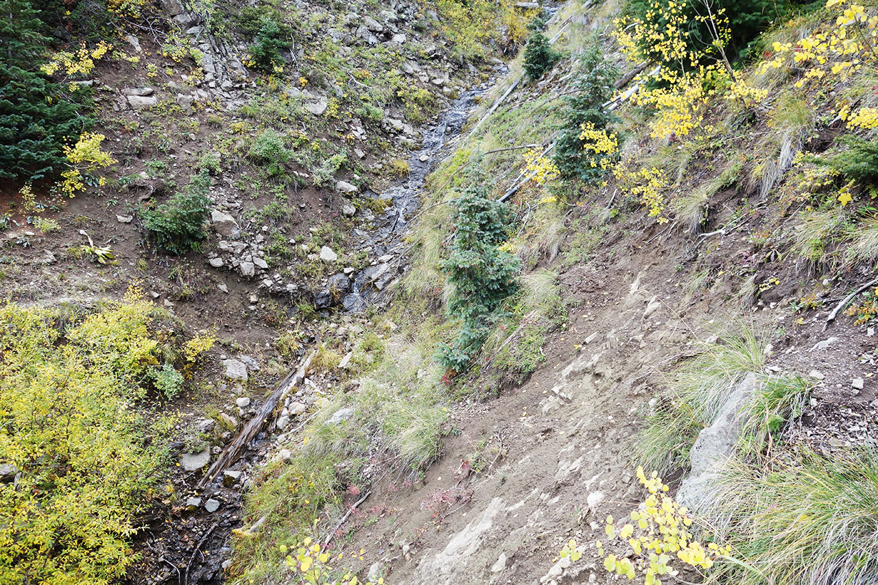 地図上ではトレイルが記されていたが、実際はかろうじてわかる程度の道で、しかも所々崩落していたので、そのたびに迂回しなくてはならず、思うように進むことができない。