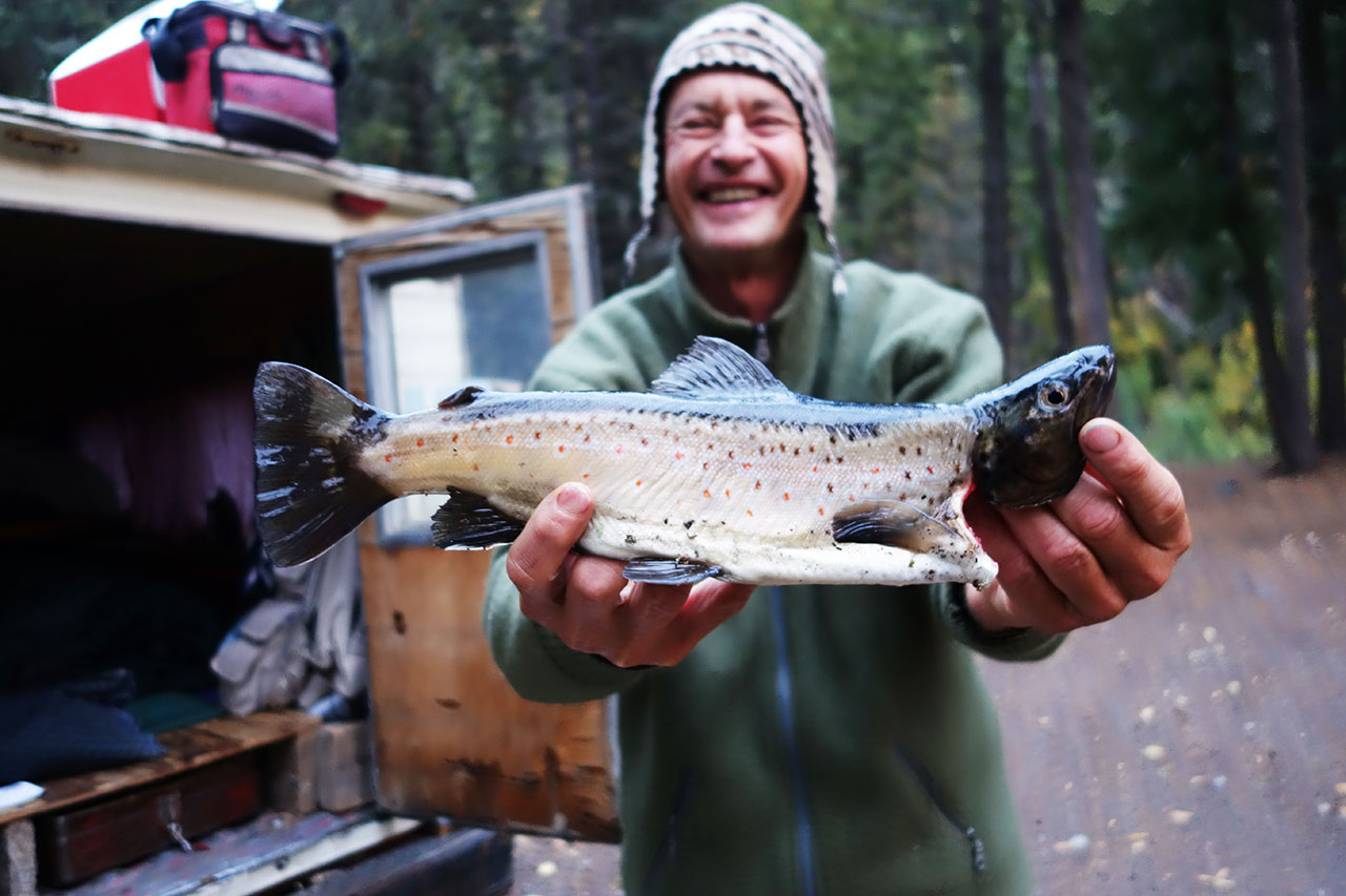 「自分で釣ったのさ、この場所はレインボートラウトの穴場でね。もう1週間くらいここで釣りしてるんだ」