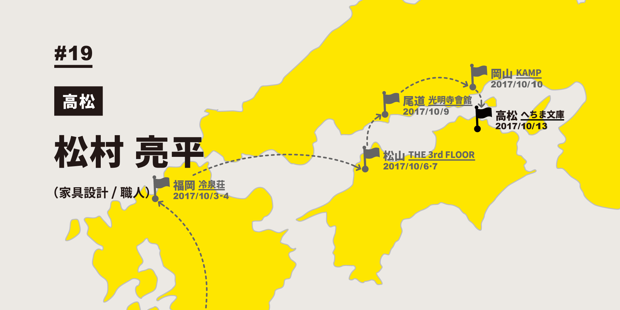 #19のゲストは、高松で『へちま文庫』『こんぶ製作所』『田中風呂製作所』、それに自分自身のプロジェクトのための『ANTIPOEME』といくつも屋号、名義を持ち、高松市の小さな山の麓で活動する家具職人 松村亮平さんです。