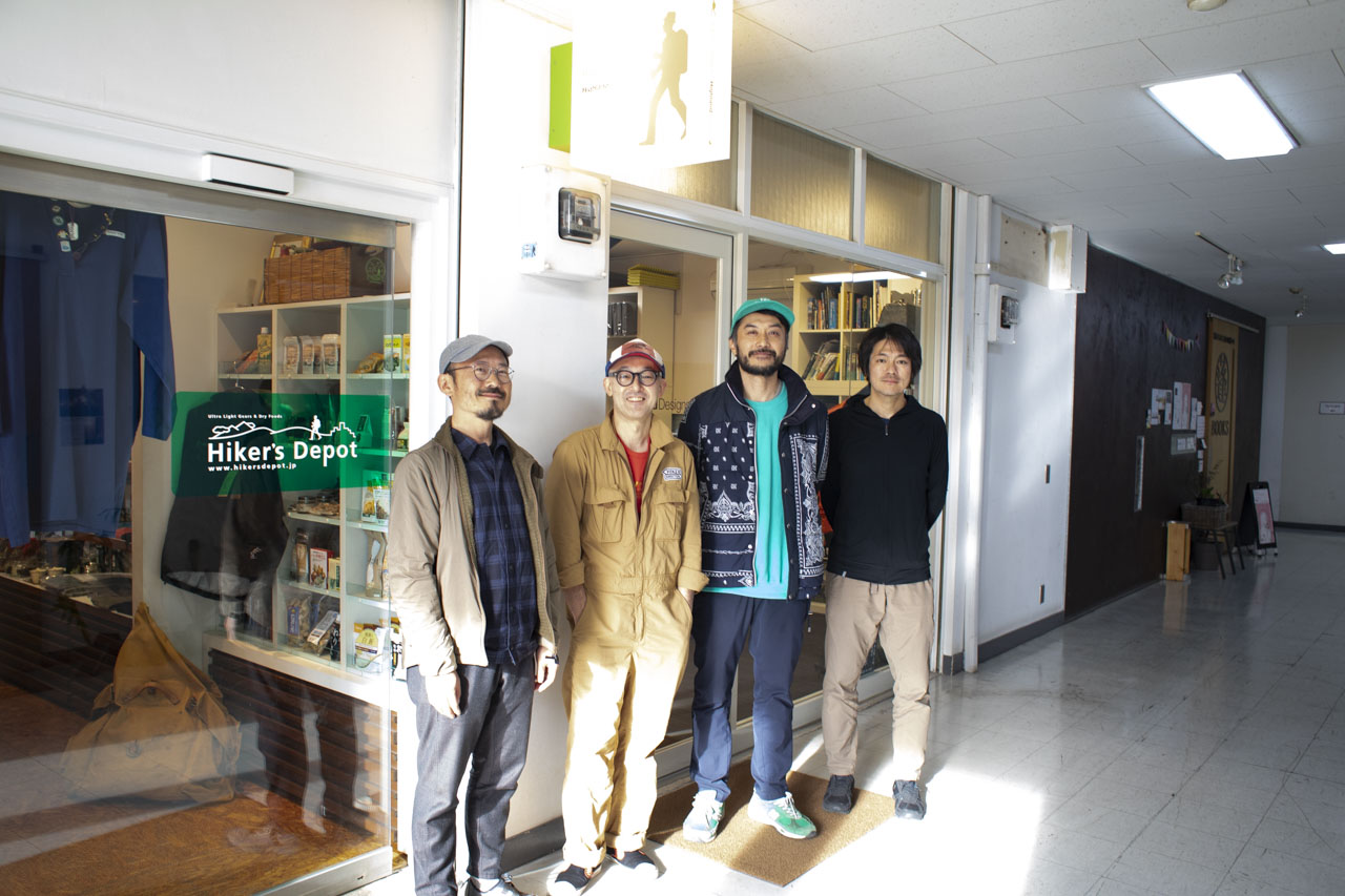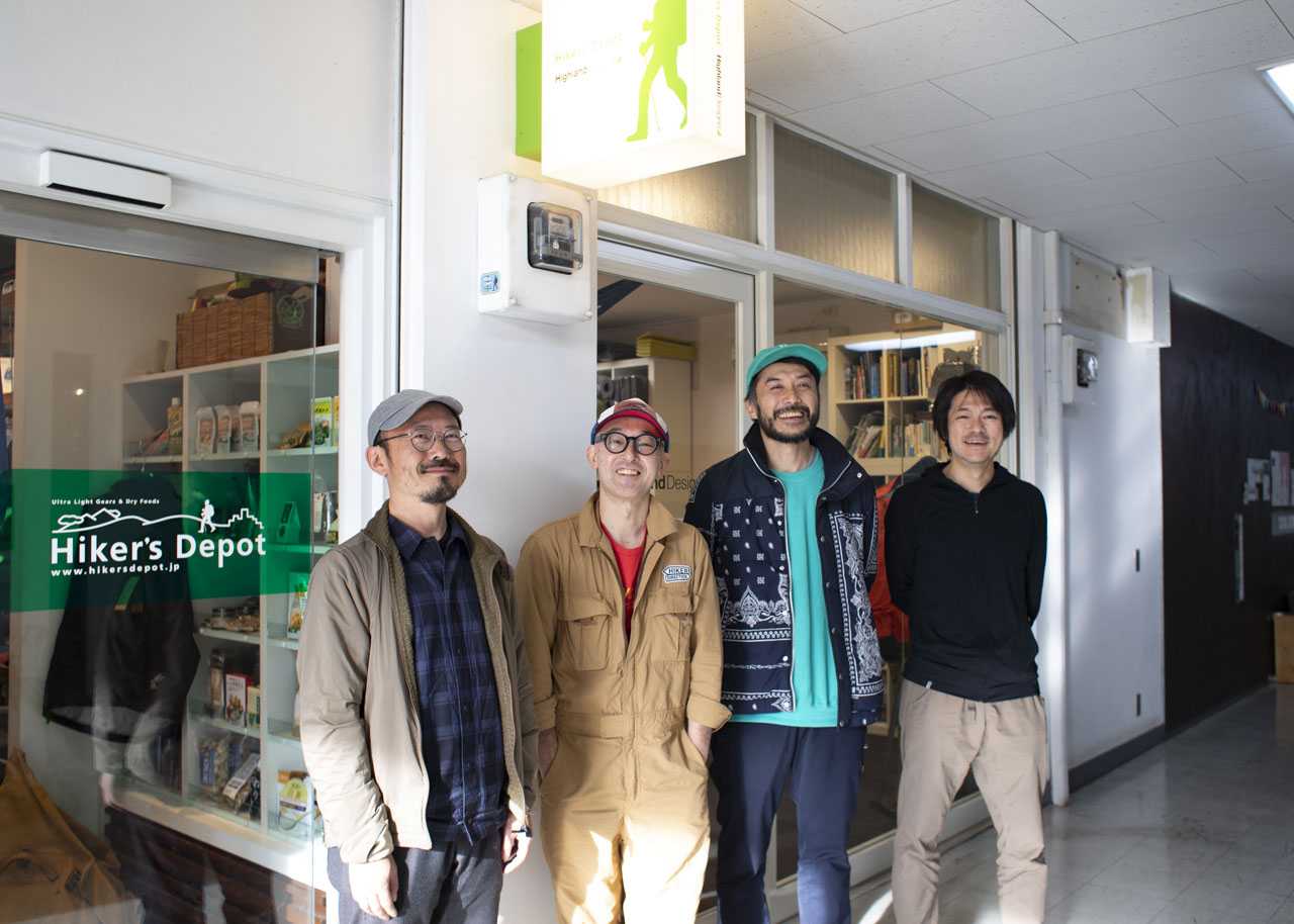 取材は2019年3月19日にハイカーズデポで行いました。左より夏目彰(山と道)、土屋智哉さん(ハイカーズデポ)、桑原慶さん(Run boys! Run girls!)、渡部隆宏(山と道ラボ)。