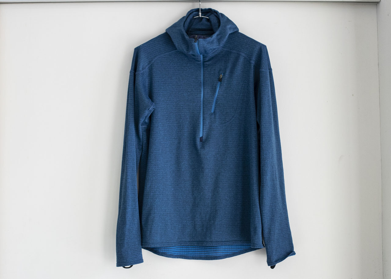 桑原 夏場に関しては無いですけど、冬になるとやっぱり出てきますね。で、冬に関してはトレイルランナーのマストアイテムがあります。ポーラテックのパワーグリッドを使ったパタゴニアのキャプリーン・サーマルウェイトのジップネック・フーディなんですけれど、これのいちばんの特徴は、グリッド状になったフリースの起毛部分と抜け部分で、抜け部分は完全に向こう側が透けるくらいの差があるんですよ。止まっていると起毛部で保温してくれて、動き出したり風が吹くと抜け部分で通気してくれると。それでさっき言ったトレランのいちばん寒い時と暑い時の気温差や運動強度による体感温度の差の振れ幅にかなり対応してくれる。なおかつハーフジップでフードがバラクラバ状になっているので、暑い時はグワって開けちゃったり、寒い時はフードをかぶったり。