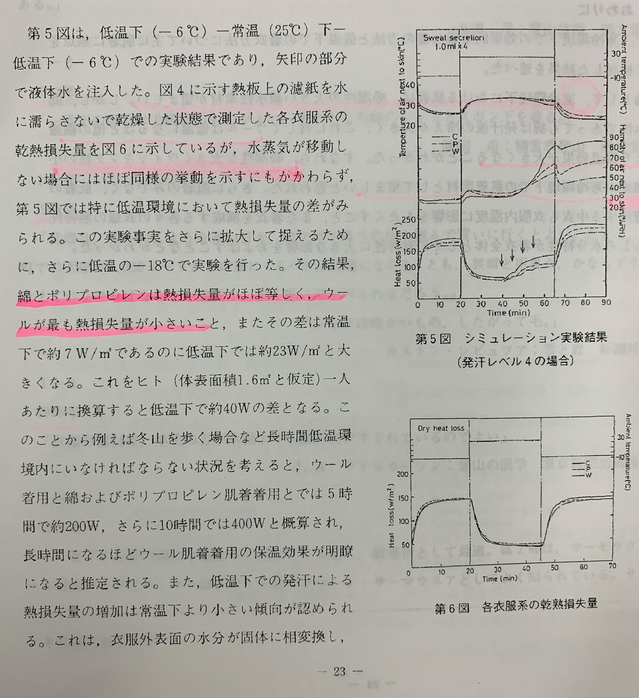 論考は寒冷環境下での肌着として望ましい素材を「吸湿性が大きくウィッキング性(汗の濡れ広がりやすさ)が小さい繊維」と定義し、具体的には「ウールが最適解である」と結論づけていた。
