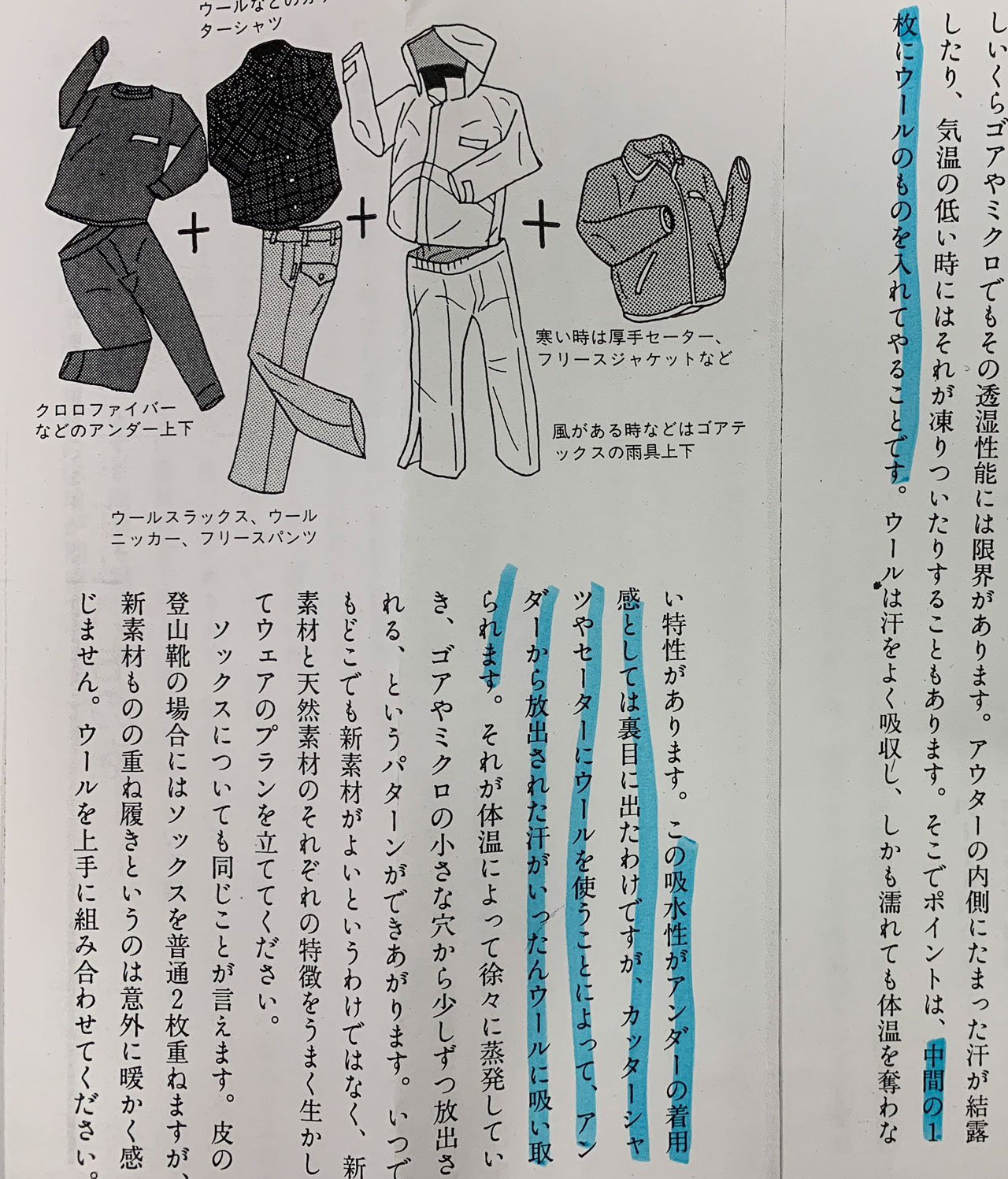 化繊アンダーウェアの優秀さが大きくアピールされていた90年代初期においてさえも、「重ね着する場面においては下着の上にウールを一枚着ておいた方が吸湿してくれるため快適である」というような記述が見受けられた。夢のような性能とされてきた化繊ウェアも、必ずしも万能ではないことが経験的に示されていたのだ。