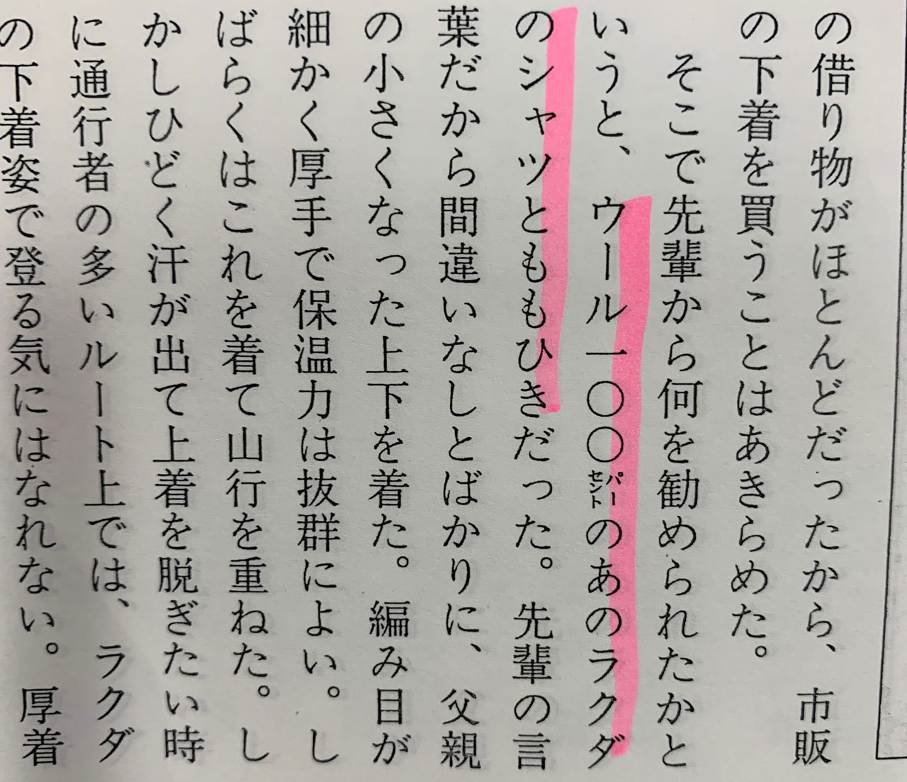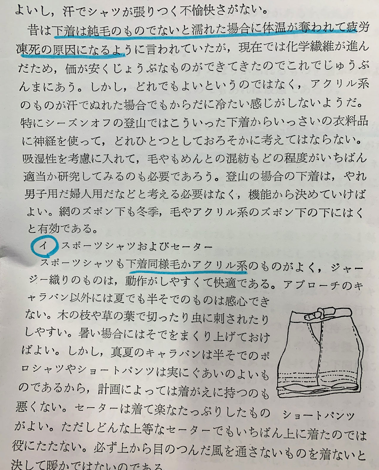 1970年代頃になると「冬山ではウール」という認識がだいぶ浸透してきたようだが、コットンも使われていた。当時の山岳雑誌には「(冬は)いちばん下にメッシュ肌着、その上にコットンもしくはウールシャツを着る」などという記述が見受けられる。まして夏山や低山では、まだまだコットン肌着がメインであったと推測される。