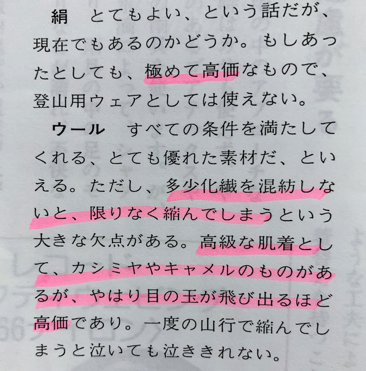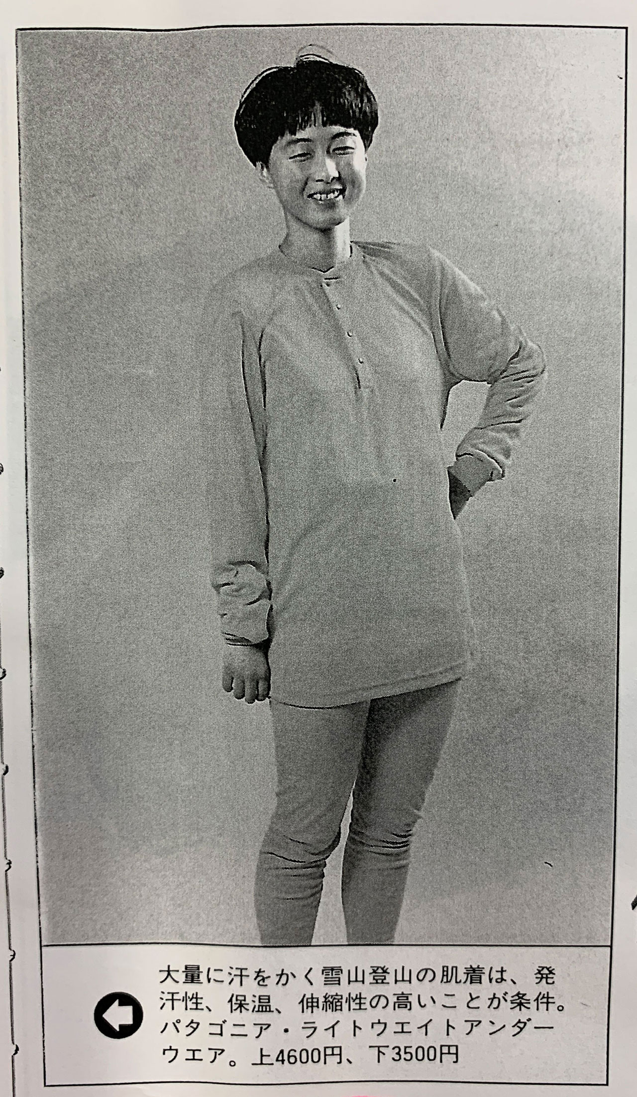 この頃用いられていたウールの肌着は今日のようなメリノウールのアンダーウェアではなく、薄手のセーターやウールシャツ、ラクダ下着といったものであり、肌へのチクチクした刺激や野暮ったいデザインなどが敬遠されていた。より肌触りが良く、ウール同様に冬山での安全性が高いとされたカシミヤやシルクの下着なども推奨されていたが、高価であるため山用のウェアとして一般化することはなかった。