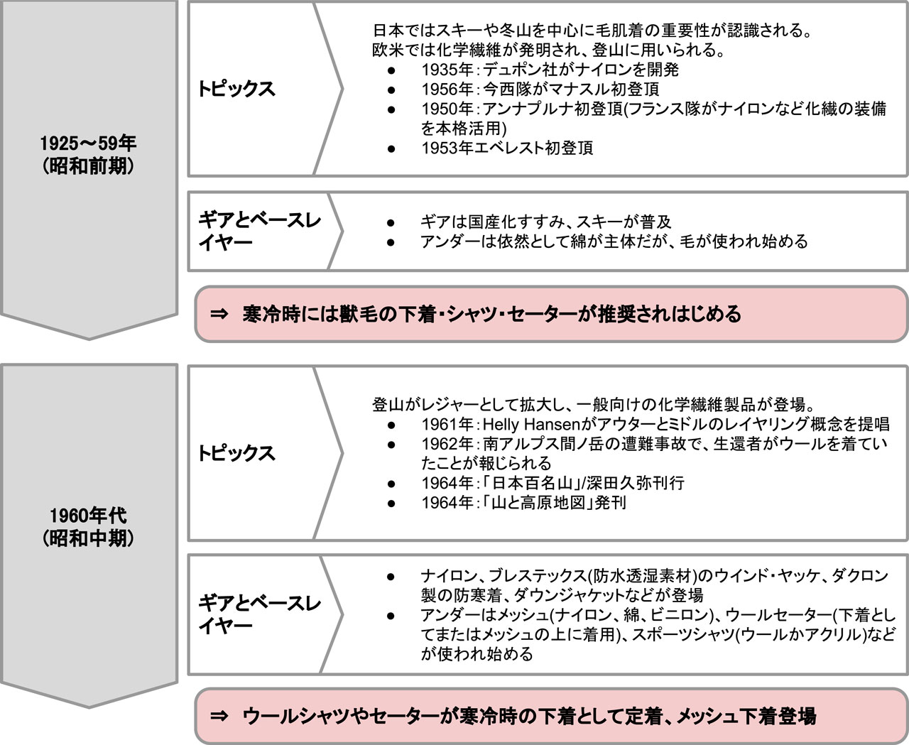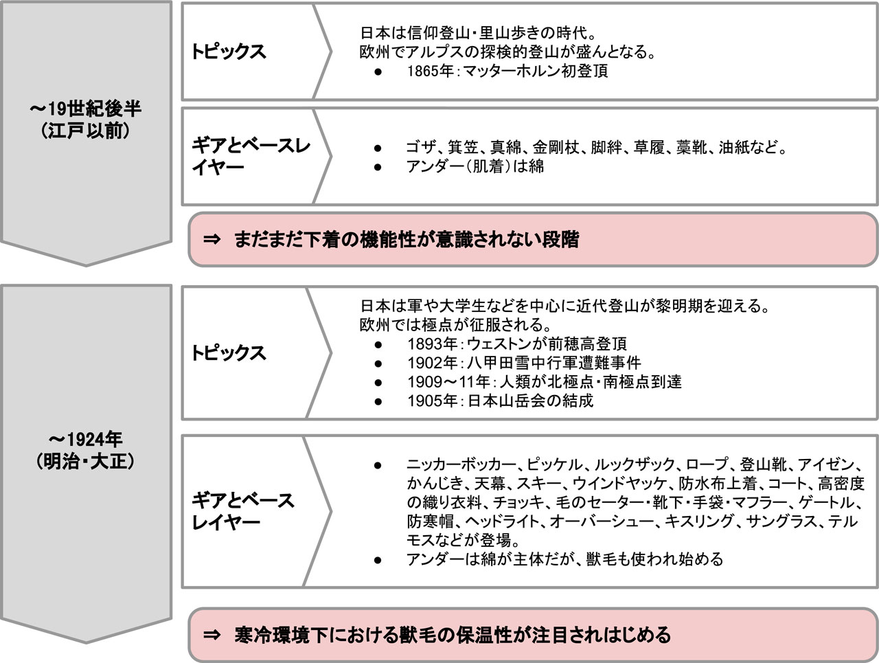以下に示すのは各種の資料をもとにまとめたベースレイヤーの発展史である。時代の区切りは筆者の判断による。関連として登山史上のトピックスおよび各時代のアウトドア・ギアについても情報を加えている。こうして時系列を追ってみると、我々が今日イメージするようなベースレイヤーという概念は80年代後半頃に確立した意外に新しいものであることがわかる。