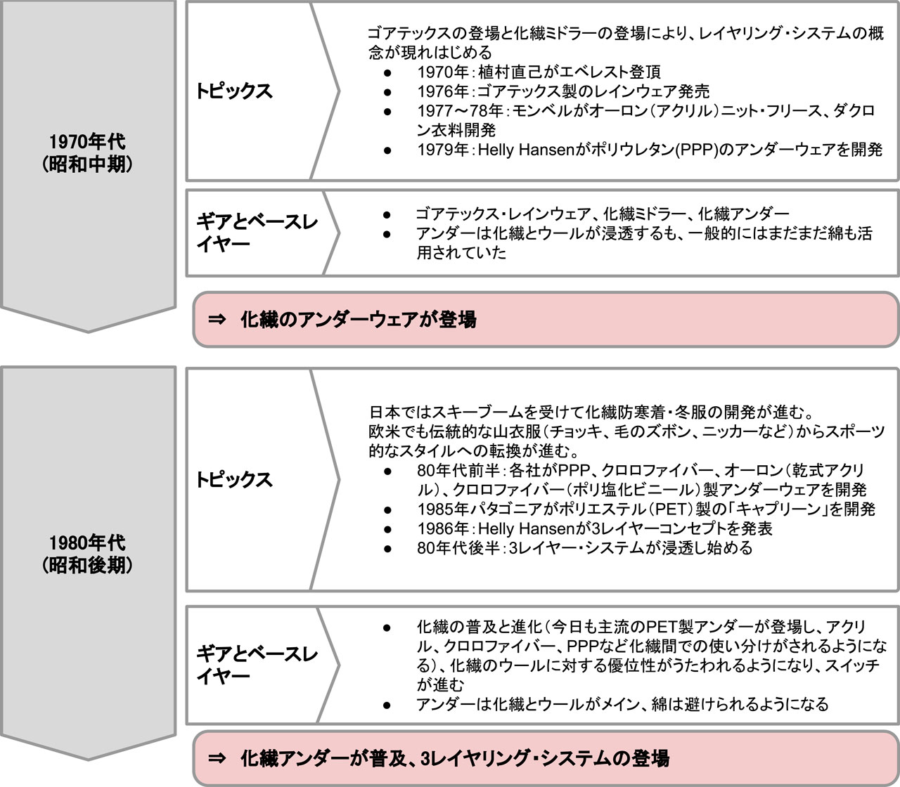 化学繊維のアンダーウェアが登場したのは70年代終わりごろであるが、本格普及したのは80年代初めのことである。最初期の製品には、ポリプロピレン(パタゴニアなどが発売)、乾式アクリル(商標オーロン、同モンベルなど)、ポリ塩化ビニール(商標クロロファイバー、同ノースケープ社など)などの素材が使われていた。70年代後半に開発されたゴアテックスのレインウェアやフリースのミドルウェアも同じ時期に普及が進んでいった。