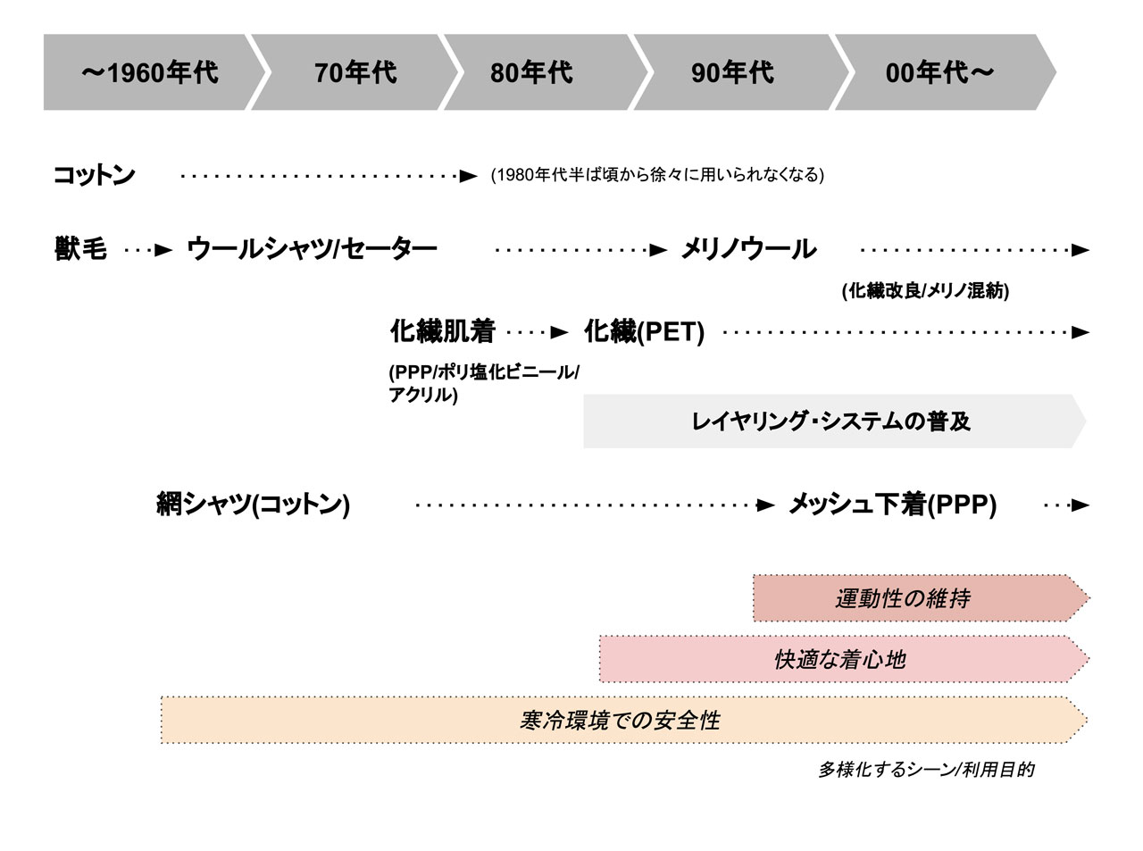 以上の通り、70年代までの天然素材の時代から、化繊が台頭しレイヤリング概念が定着した80年代、ウールが復権した90年代、アクティビティのひろがりと共に多様化してきた00年代以降というのが、大まかなベースレイヤーの発展史である。ベースレイヤーはアウトドアでの安全性(保温性)を確保しつつ快適に着用できる下着として80年代後半からレイヤリング・システムと並行的に普及発展し、着用シーンやアクティビティの広がりに応じて、快適性能を重視したものや、より運動性の維持(ランニング)を追求したものなどに分化してきていると言えるだろう。