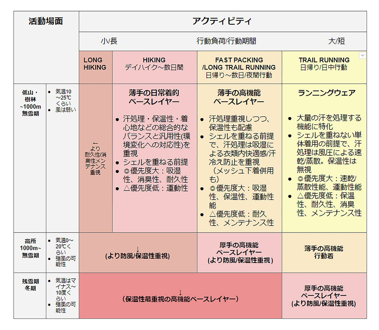 表を見ると、高所およびロングのトレイルランニングとファストパッキングで必要とされる行動着の要件がおおむね重なってくることがわかる。