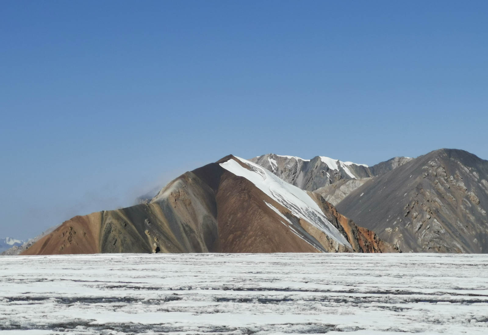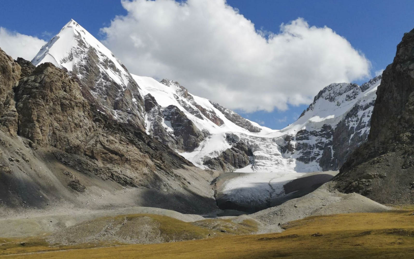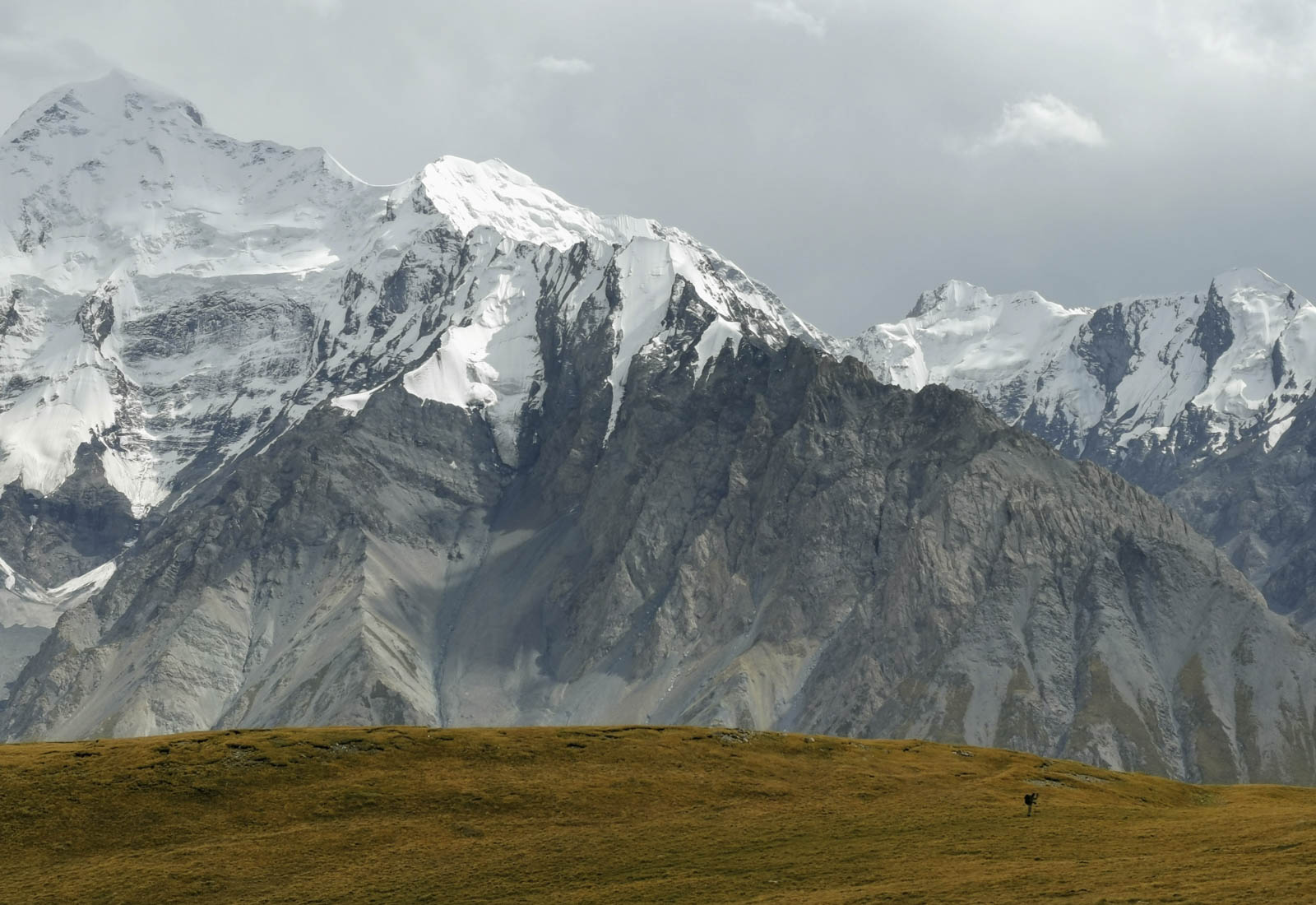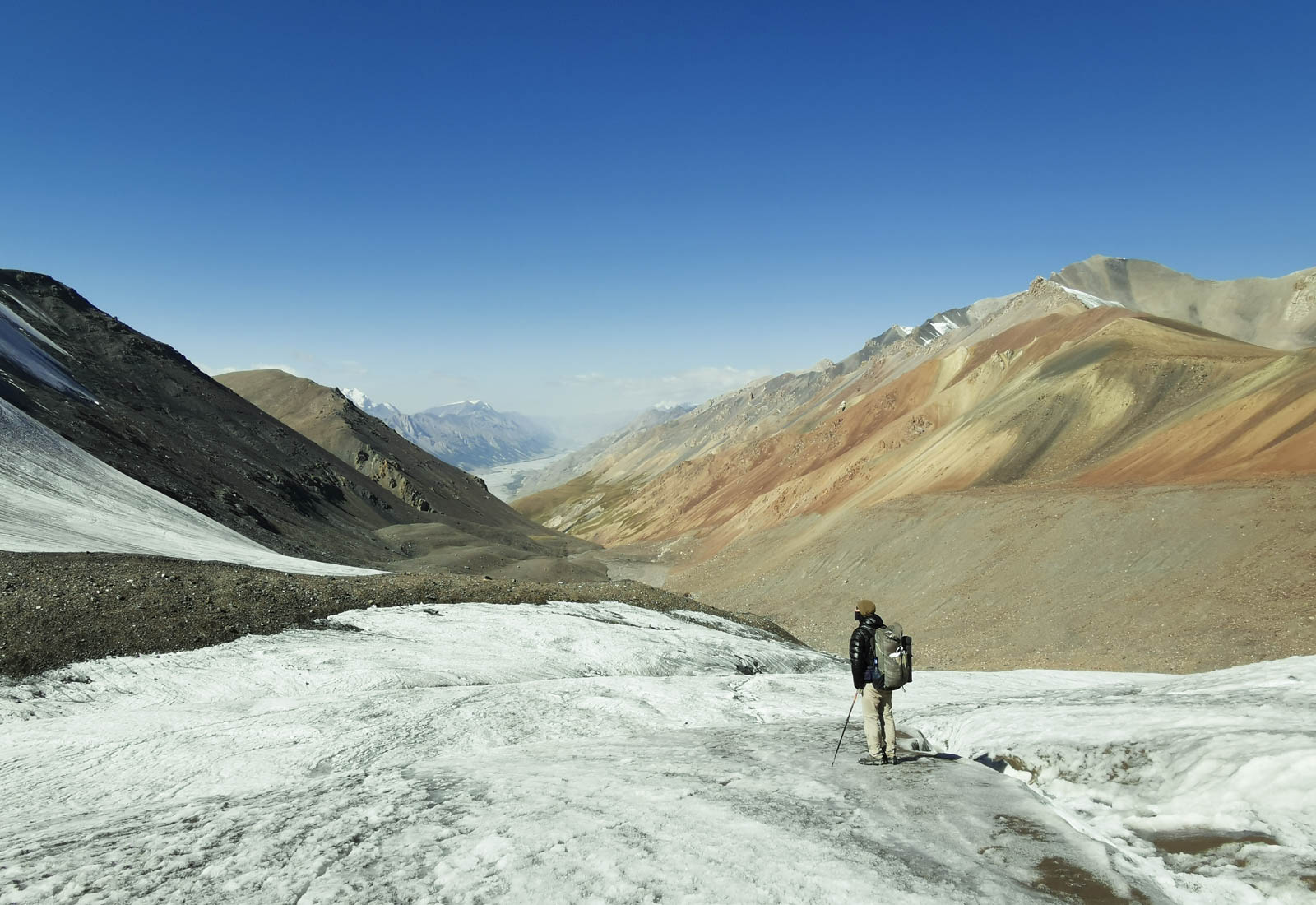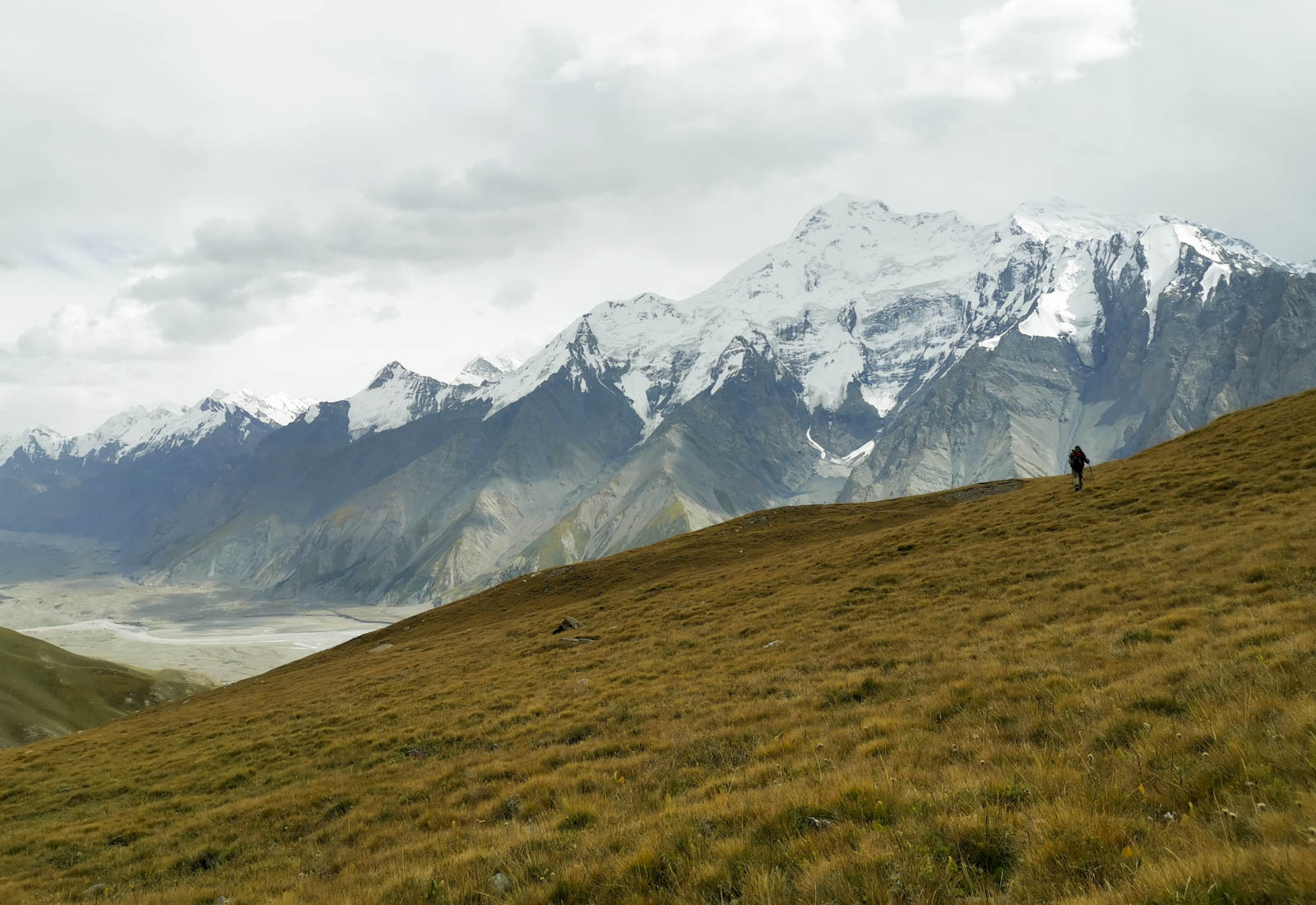 数日間、わたしたちはとにかく歩き続けた。氷河を渉り、4200mの峠を越えた先には、壮大な景色が広がっていた。眼下に広がるは、全長62kmの氷河からの融解水から成るイニリチェク川。遠くに聳え立つは天山山脈最高峰のポベーダ山。ここから川に沿って歩き、氷河を50km歩いて標高4800mのビューポイントを目指す予定だ。