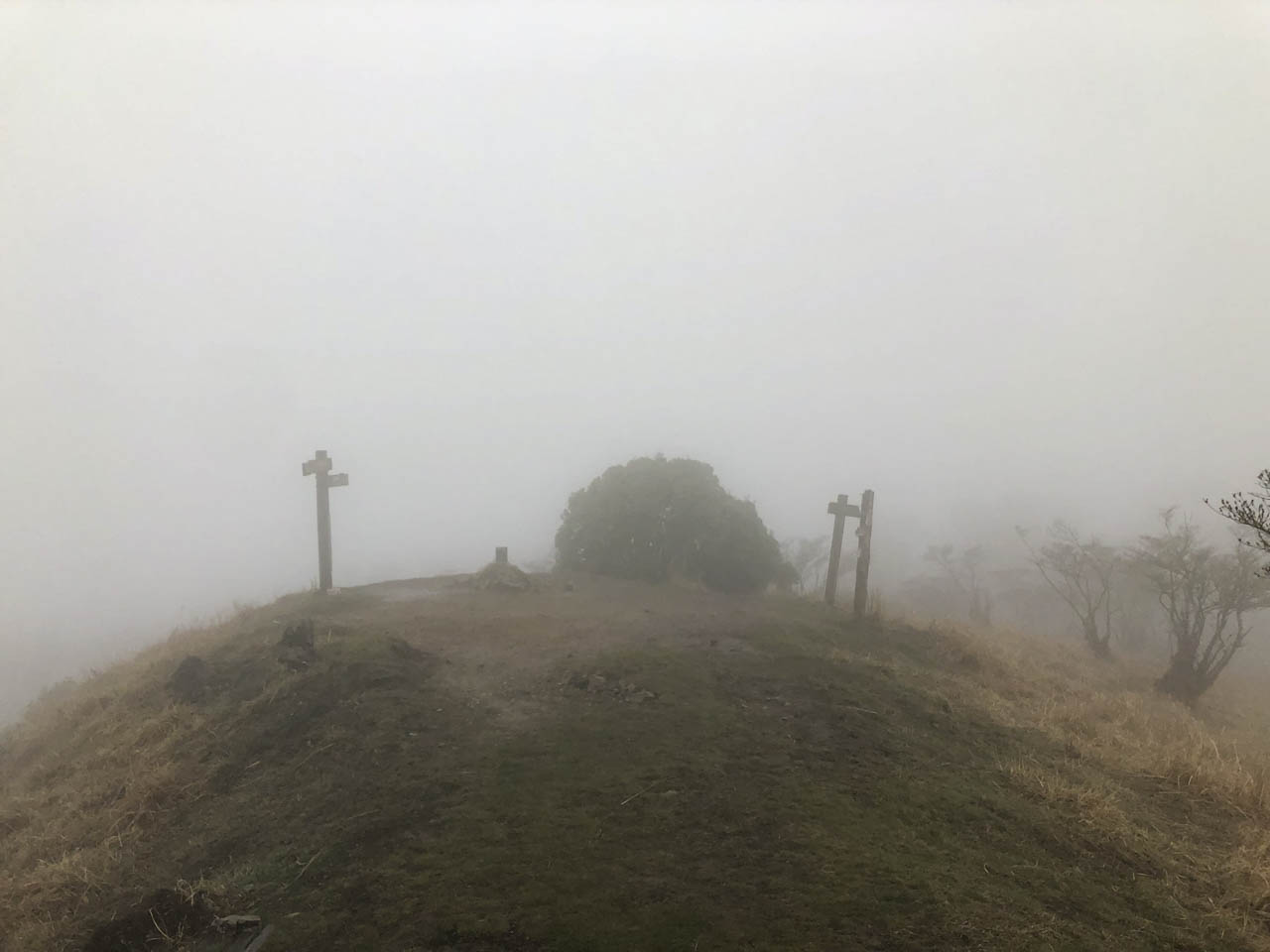 18時ごろ頂上に到着。まだ日は落ちていないが辺りは霧で一面真っ白で景色どころではない。辛かった記念に頂上の道標だけ写真に収め、すぐに下り始める。