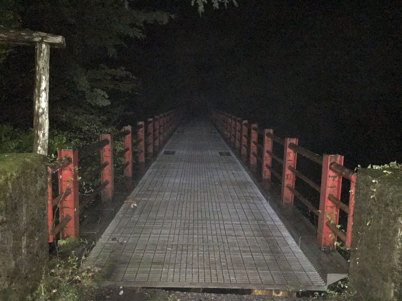 深夜に通った赤い鉄橋。滝の爆音が怖く、そそくさと渡った。
