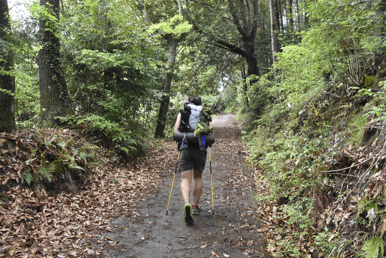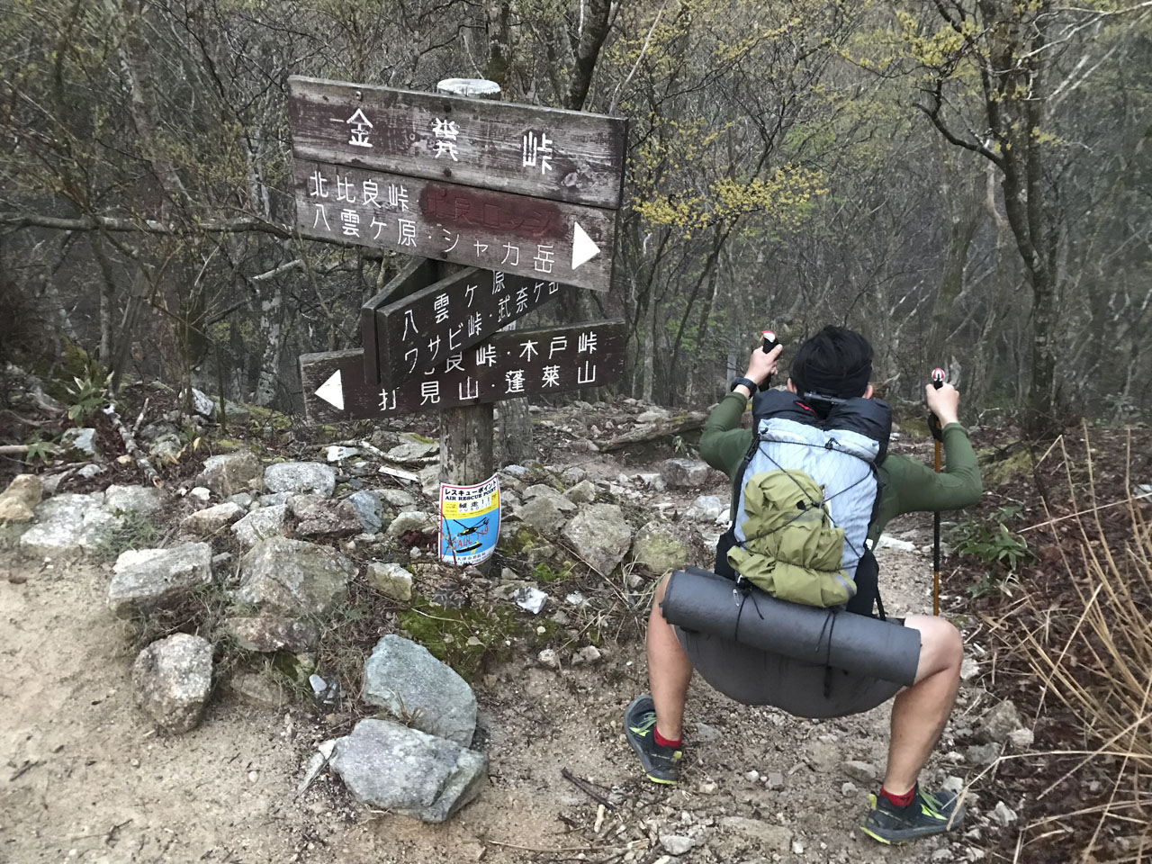 公道をパワーウォークで進み二ノ谷山への登山道入り口で、北から南へ縦走中のお兄さんに会った。僕らがこれから進むルートを辿ってきていたというので、いろいろ情報を伺ってみると、大御影山以降は何度か水場があるらしい。「事前情報とちゃうやん!」とツッコんだが、心配事第1位だった水事情が解決されてホッとしつつ、でもローソンから担いできたこの水は何だったのだろうと悲しくなった。