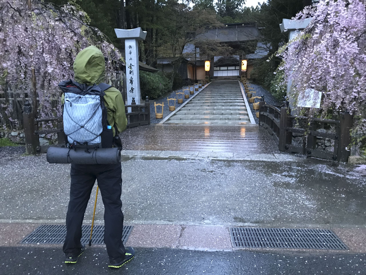 5時過ぎ、空が白んできて下のほうに街灯が見えてきた。高野山だ。歩いていると後ろから前田選手が小走りで追いついてきた。一緒に根本中堂まで歩き一礼。とても綺麗な枝垂れ桜が正面を飾っていたのでお互い記念撮影をした。