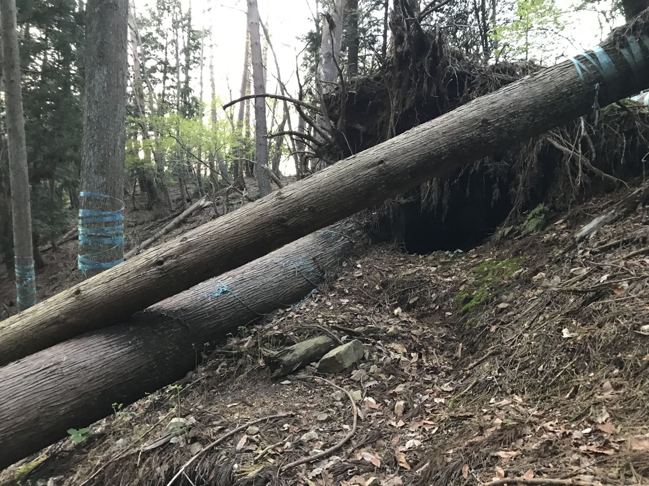 「でもそれらしい道無かったよな?」大原選手と話しながら戻り、もう一度登山口から辺りを見渡すがそれらしい道が見当たらない。たまらず携帯地図アプリを開くと、道は見えないがルートは倒木だらけの方向を指している。とてもルートとは思えないが倒木をよじ登っていくと奥に踏み跡が見つかった。これは夜間に通ったメンバーは苦労するだろうと思いながら、実行委員の意地の悪さを感じた。