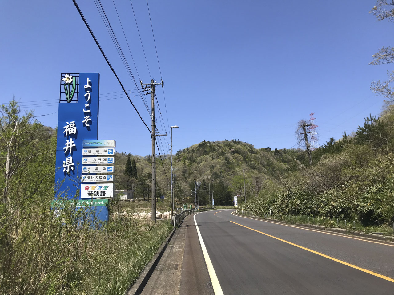 国境高原スノーパークから出て左に曲がり下り基調の国道161号線を北上していく。直ぐ左手に「ようこそ福井県」の大きな看板がありそこに「気比の松原まで18㎞」の案内も書かれていた。その看板を写真に撮り、高島トレイルの景色と一緒にSNSに投稿した。