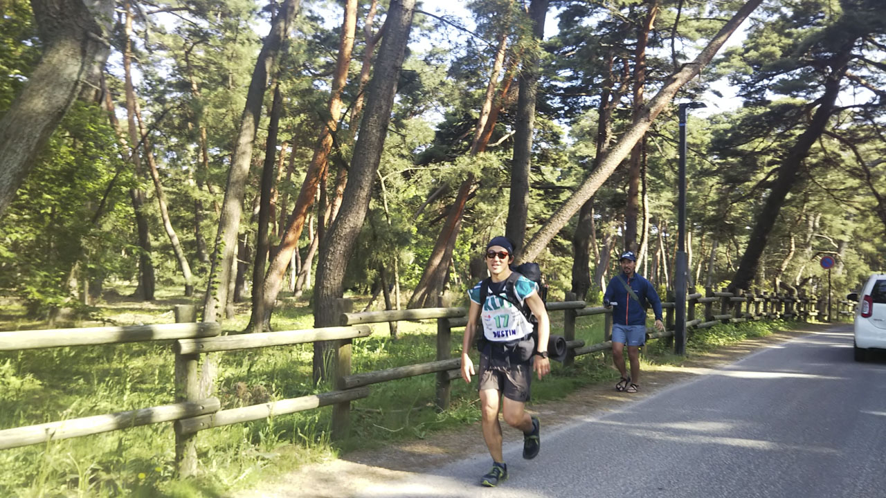 気比の松原への直線ルートに入り、遠くにハンディカメラで待ち構えた人が見えた。米田選手だ。夫婦で出場しており、今回は残念ながら途中リタイヤとなってしまったが、ゴールまで応援に来てくれていた。足裏のダイオウグソクムシについて熱弁しながら気比の松原の公園内へ入った。
