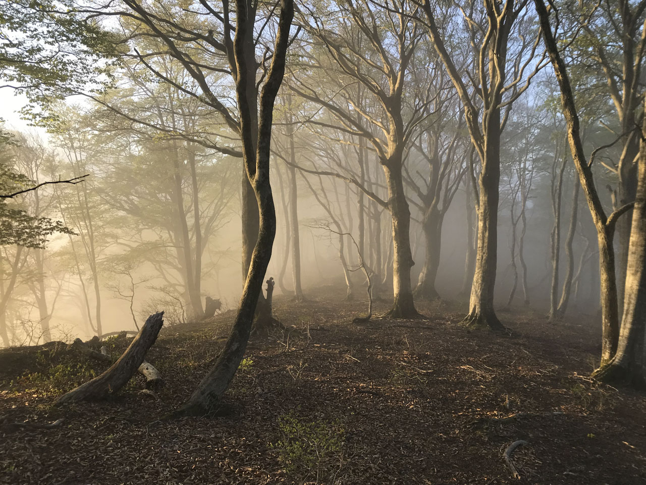 5時ごろ、大御影山を難無く越え、東へ北へとルートを辿っていく。温かい太陽の光が森全体に差し込んでいく。動きやすい格好に着替えるため一旦停止し、大原選手に先へ行ってもらう。そのついでに朝食におにぎりとカロリーメイトを食べた。