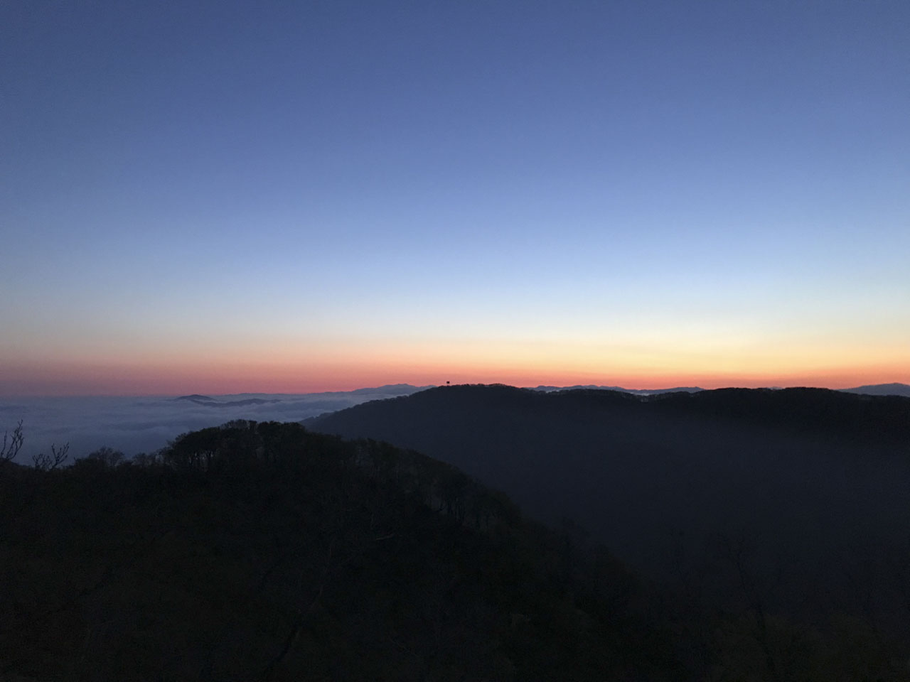 4時半ごろ、調子が戻った自分が先行し、大御影山への稜線ルートを気持ちよく北上していると東から朝日が昇ってきて高島トレイルの山容を綺麗に見せてくれた。写真を撮り「おはようございます」の一行とともにハッシュタグ#高島トレイル#朝日#KLTRでSNSに投稿した。