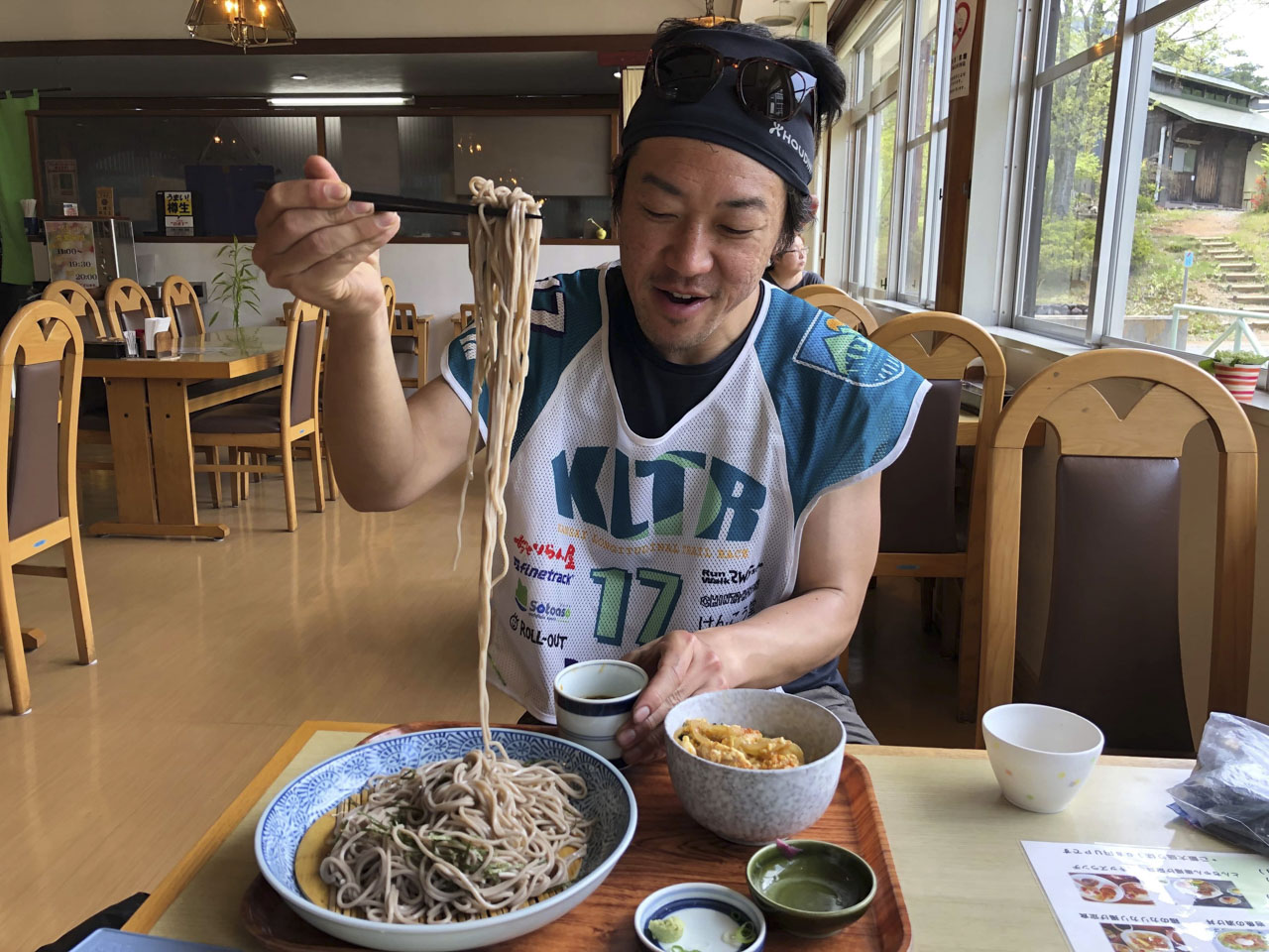 頂上を越えてすぐのルート上に同じビブスを着た選手が座って昼食をとっている。まさかの北野選手だ。どうやら太腿部の筋肉を傷めてしまったようで、思うように下れないらしい。本レース中にビールを飲んでいる同志として、ゴールの気比の松原での乾杯を誓い先へ進んだ。