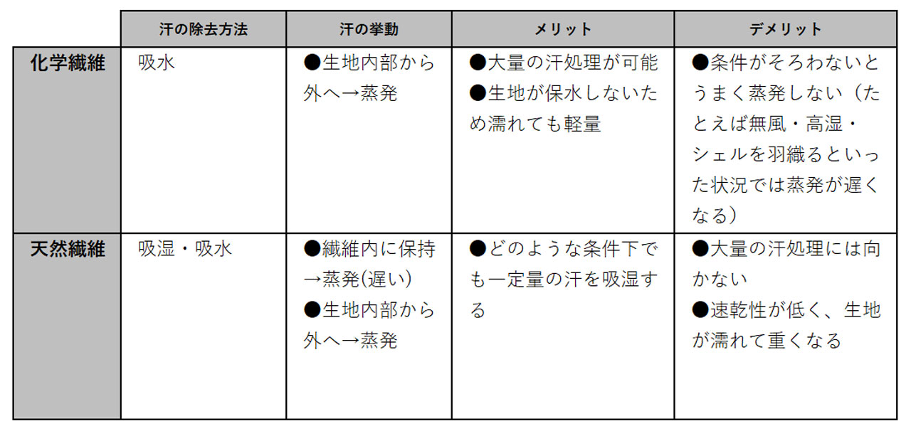 天然繊維と化繊の汗処理メカニズムを比較してみると、汗の量や外部環境によってそれぞれにメリットとデメリットがあり、片方が一方的に優れているというようなことではないことがわかる。