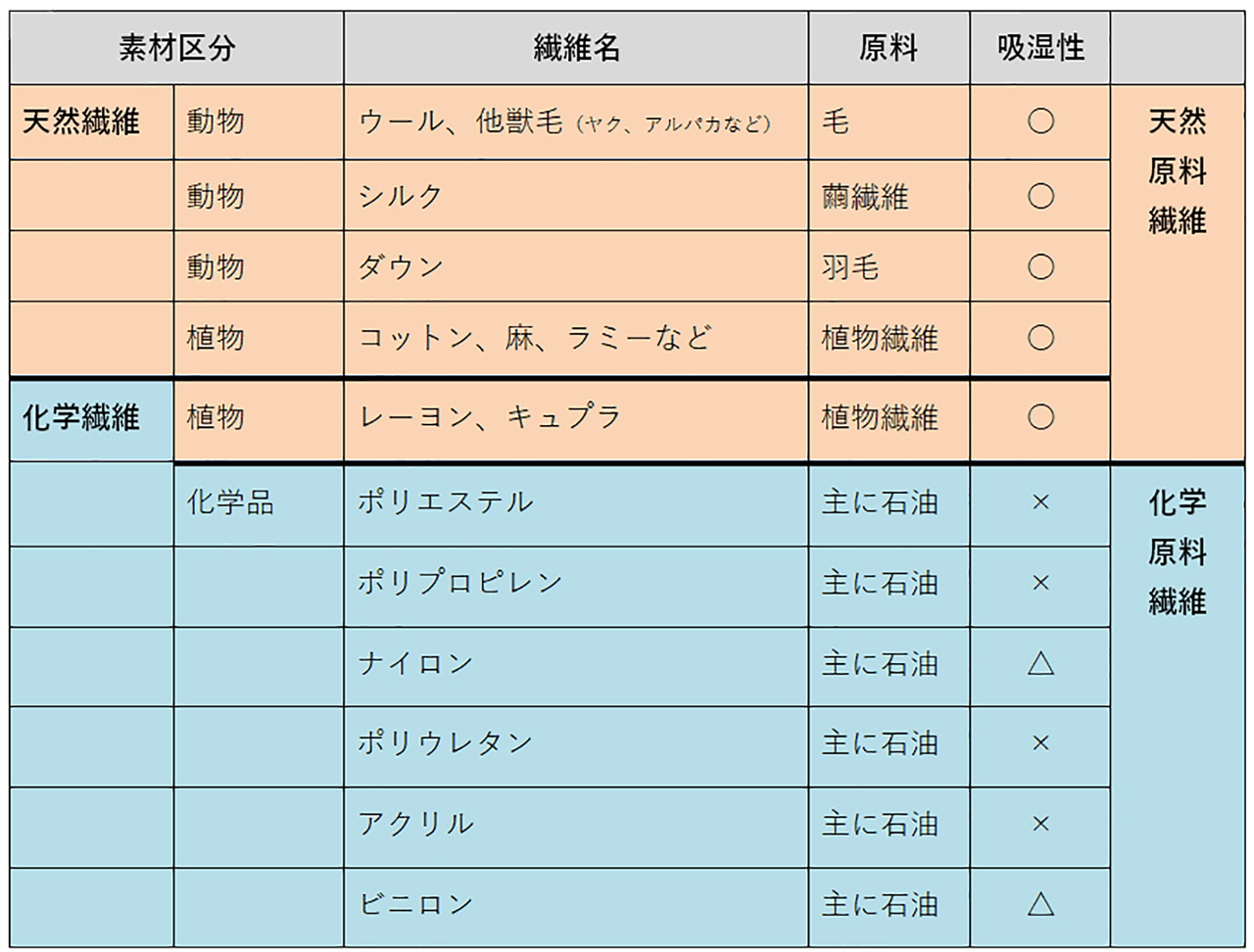 ※参考:繊維ファッション産学協議会。○×△で示した「吸湿」は、それぞれの繊維が通常どの程度の水分を含んでいるかというデータ(後述の公定水分率)にもとづき筆者が補足したもの。表に掲載した以外にも、植物繊維に化学品をプラスして加工した半合成繊維(アセテートなど)と呼ばれるものもある。