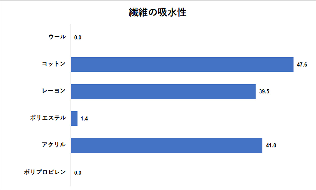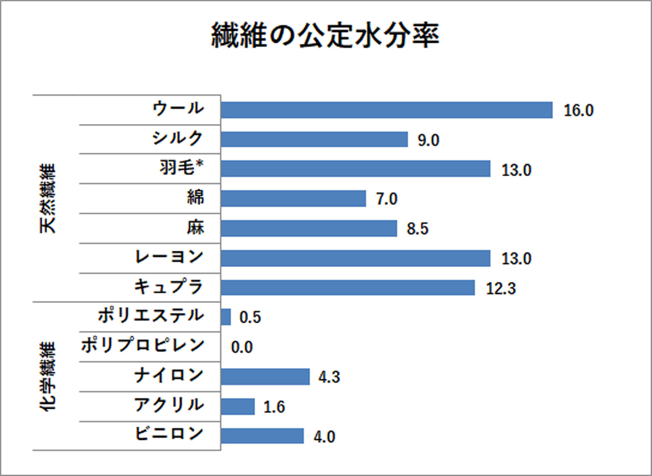 グラフを一見しただけでも、天然繊維(天然原料繊維)は水分率が高く、化学繊維(化学原料繊維)はほとんど水分を含まないことが理解できる。ビニロンやナイロンは化学繊維の中でも珍しく吸湿性をもった素材とされているが、天然繊維で最も水分率の低い綿(コットン)よりもさらに値が低く、あくまで例外的な存在であると言える。