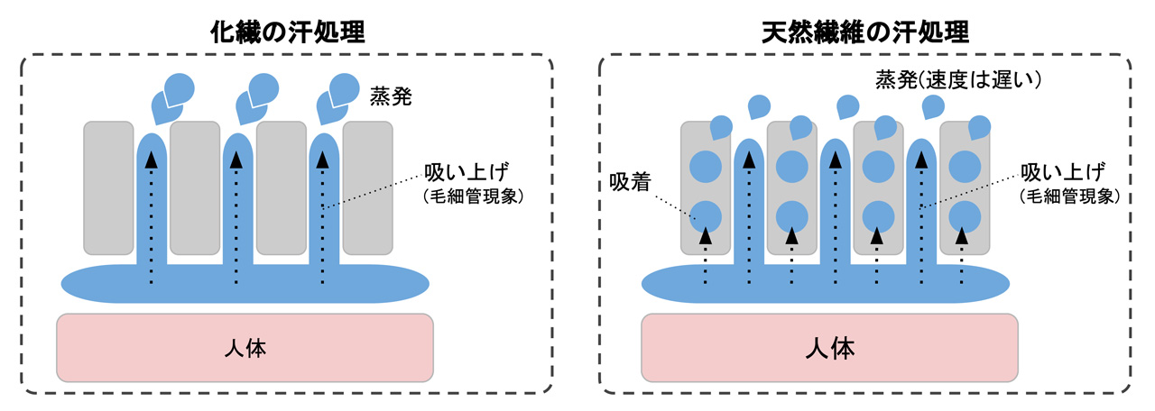 概念図:化繊と天然繊維それぞれの汗処理方法