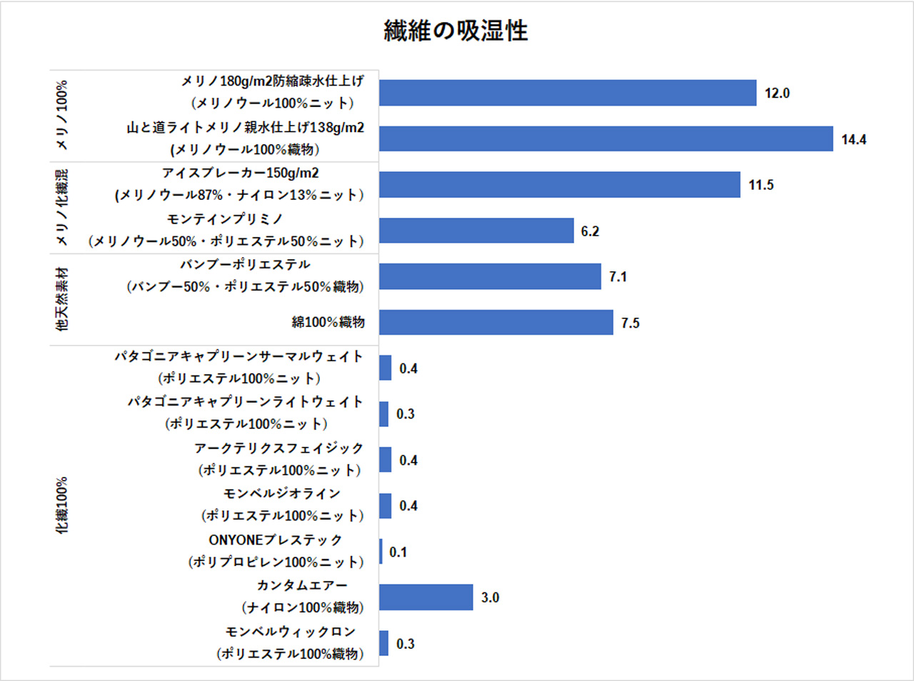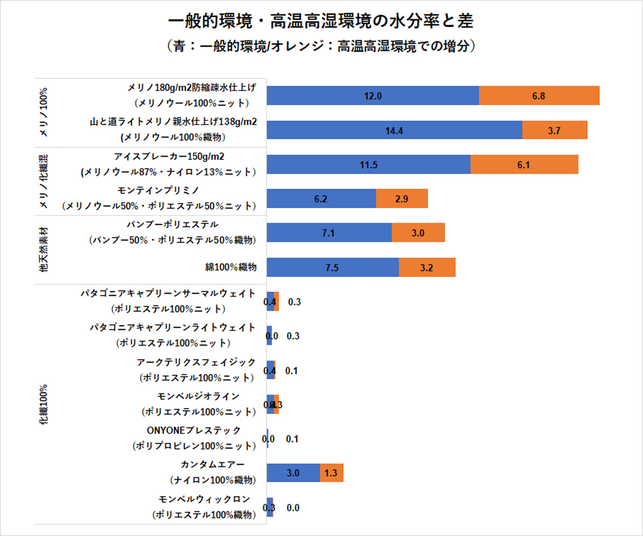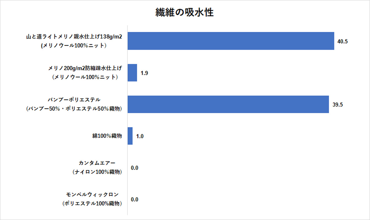 コットン(図の表記では綿100%織物)は一般的に吸水性に優れた素材とされており、この実験でも高い値が期待されたが、ほとんど水を吸い上げなかった。ウールも親水性の加工を施したものは吸水したものの、アウトドア衣料で一般的に用いられている疎水性ウールは水をはじいてしまい、ほとんど吸水しなかった。ナイロン、ポリエステルの吸水もゼロであった。