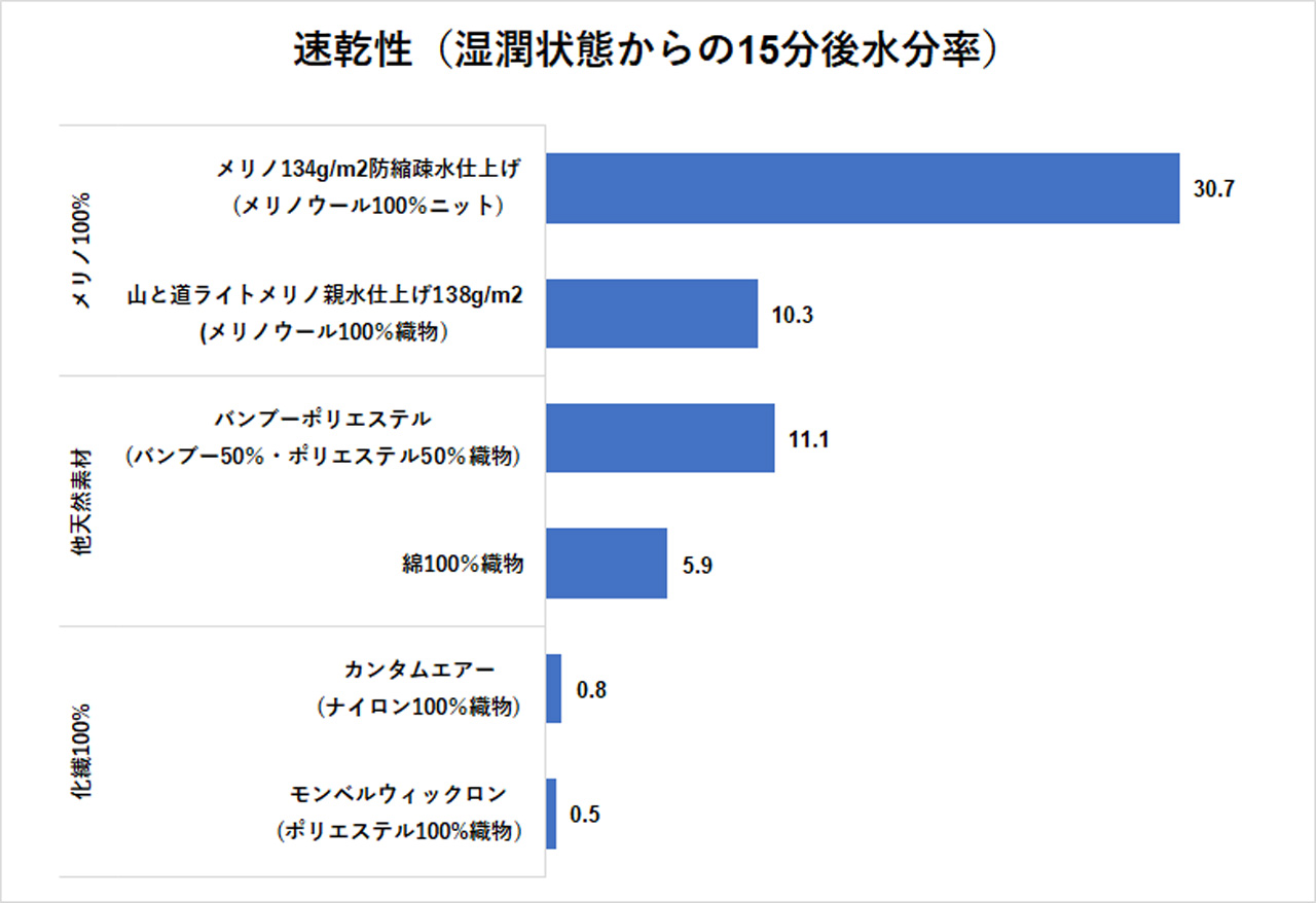 吸水と関連する性質として速乾性がある。こちらは繊維の種類のみならず、生地そのものの厚みや織り方が影響すると思われるが、検査結果を以下に示す。水分率がもともと低い化繊が速乾性でも有利となっている。親水性のメリノウールは疎水性のウールより脱水後の水分率が低く、速乾性でも優れた結果を示した。