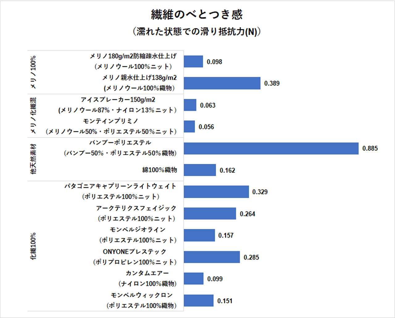 また、この比較は摩擦の大きさのみの比較であるが、どの程度の水分でベトつくかという指標もある。ある論文では、コットンとポリエステルとを比較して、ポリエステルの方がより少ない水分で摩擦力の最大値に達する(つまり少しの汗ですぐにベトつく)という実験結果が示されている。個々の製品や加工内容による差異はあるものの、一般論としては吸湿しない繊維の方が肌への貼り付きが発生しやすい(天然繊維の方がベトつきにくい)といえるであろう。