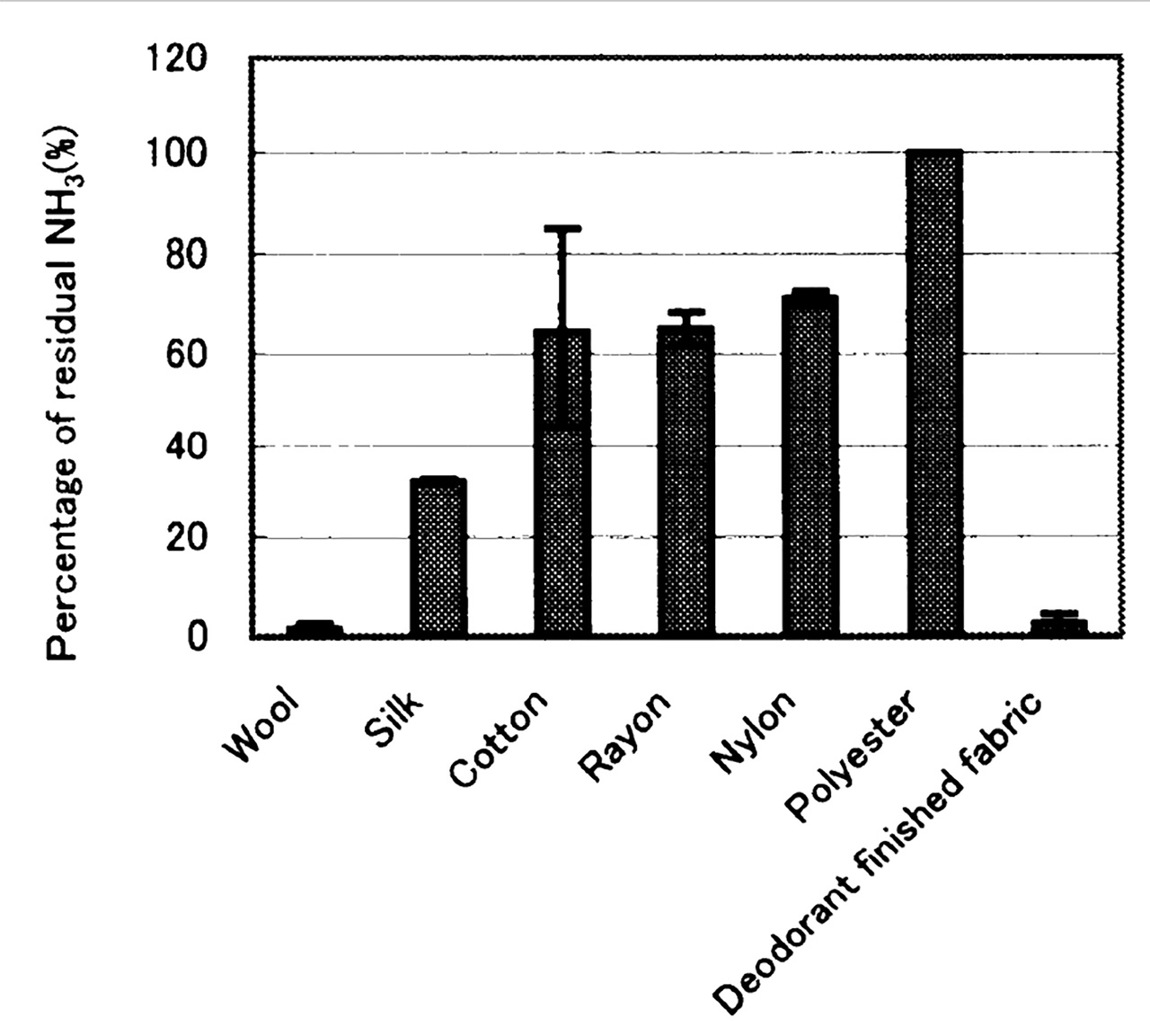 下図は代表的な悪臭物質であるアンモニアの残存率を示したものである。天然繊維の中でもウールの消臭性はずば抜けており、次にシルクが続く。コットンやレーヨンはそれほど高くない。ナイロンは化繊だがやや消臭性があり、ポリエステルに至ってはほとんど消臭性がない。