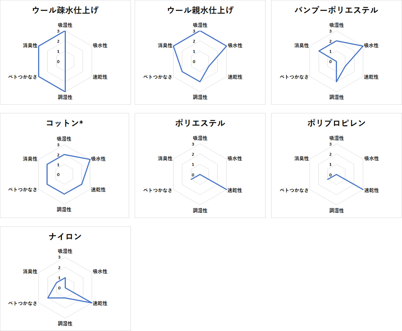 以下に示すチャートは、各素材の特徴を端的に把握すべく、各項目について3点満点で評価を行いチャート化したものである。