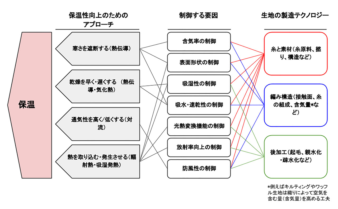 以下図表に示されているように、生地の保温性を高めるための方策とテクノロジーにはさまざまなものが開発されており、糸や編み構造、仕上げの加工などを工夫することによって、生地全体の保温性を調整することができるようになっている。近年では夏場の炎暑対策として、あえて保温性を低めた涼しい生地の開発も盛んである。