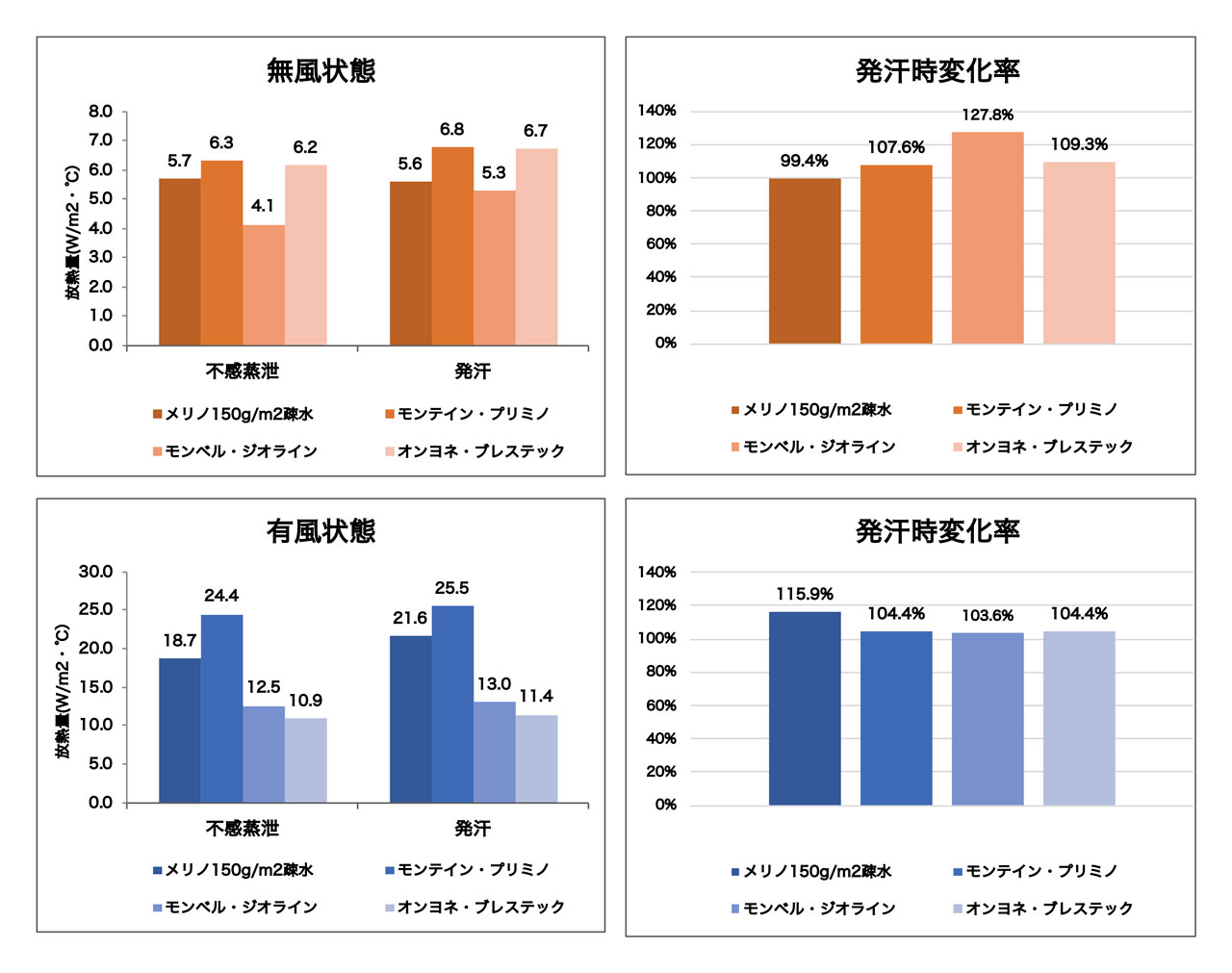 無風状態では、「モンベル・ジオライン」の保温性が高く(エネルギー消費が少なく)、以降は「メリノ」、メリノと化繊混紡素材である「モンテイン・プリミノ」、「オンヨネ・ブレステック」と続く。発汗時は「モンベル・ジオライン」の保温性が低下し「メリノ」と近づく。「メリノ」は発汗時もほとんど変化がないのに対し、化繊との混紡や化繊100%素材は発汗時の保温性が低下する。