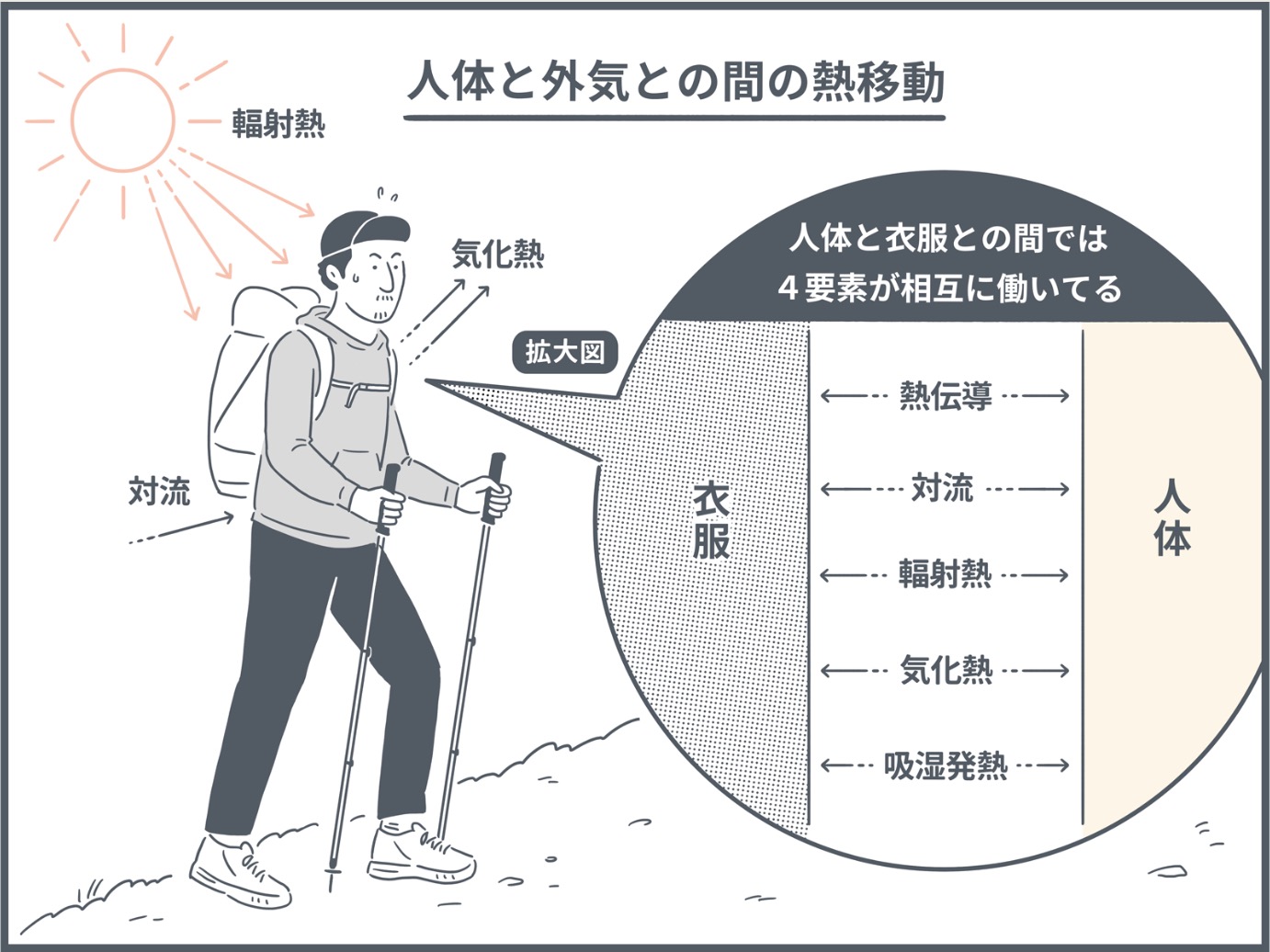 寒い時期の低山ハイクであれば風の影響が少ないため断熱性の高いインサレーションウェア(=熱伝導)が重要となり、高所ハイクであれば稜線上の強風に備えるためのしっかりとしたアウター(=対流)が重要となる。トレイルランであればストップ時の汗冷え対策(=気化熱)が重視されるであろう。