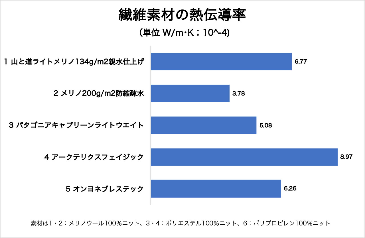 以下の図はベースレイヤー製品に用いられている様々な生地の熱伝導率を測定したものである(乾燥状態)。数値が小さい方が熱伝導率が小さい=暖かいということを示す。