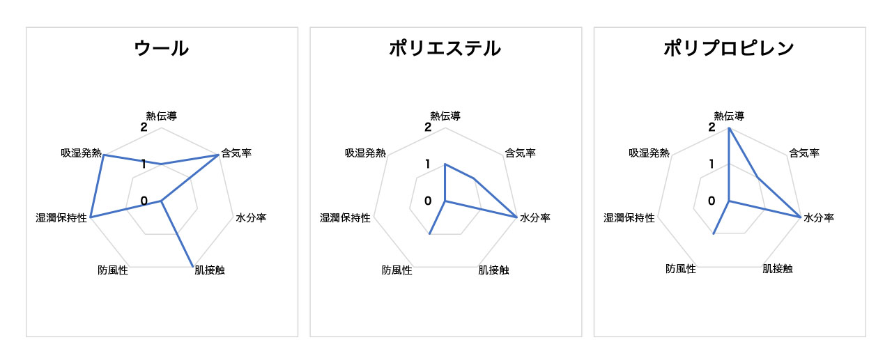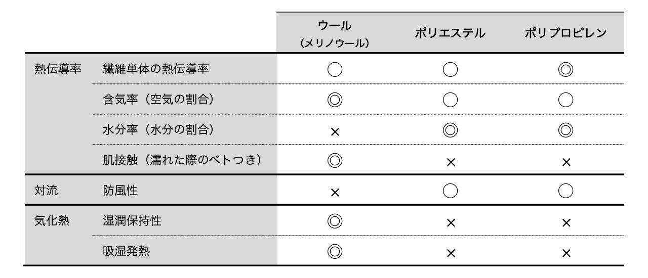 この表ではアウトドアのベースレイヤーまたは肌着として利用される代表的な素材として、ウール(メリノウール)、ポリエステル、ポリプロピレンを取り上げた。