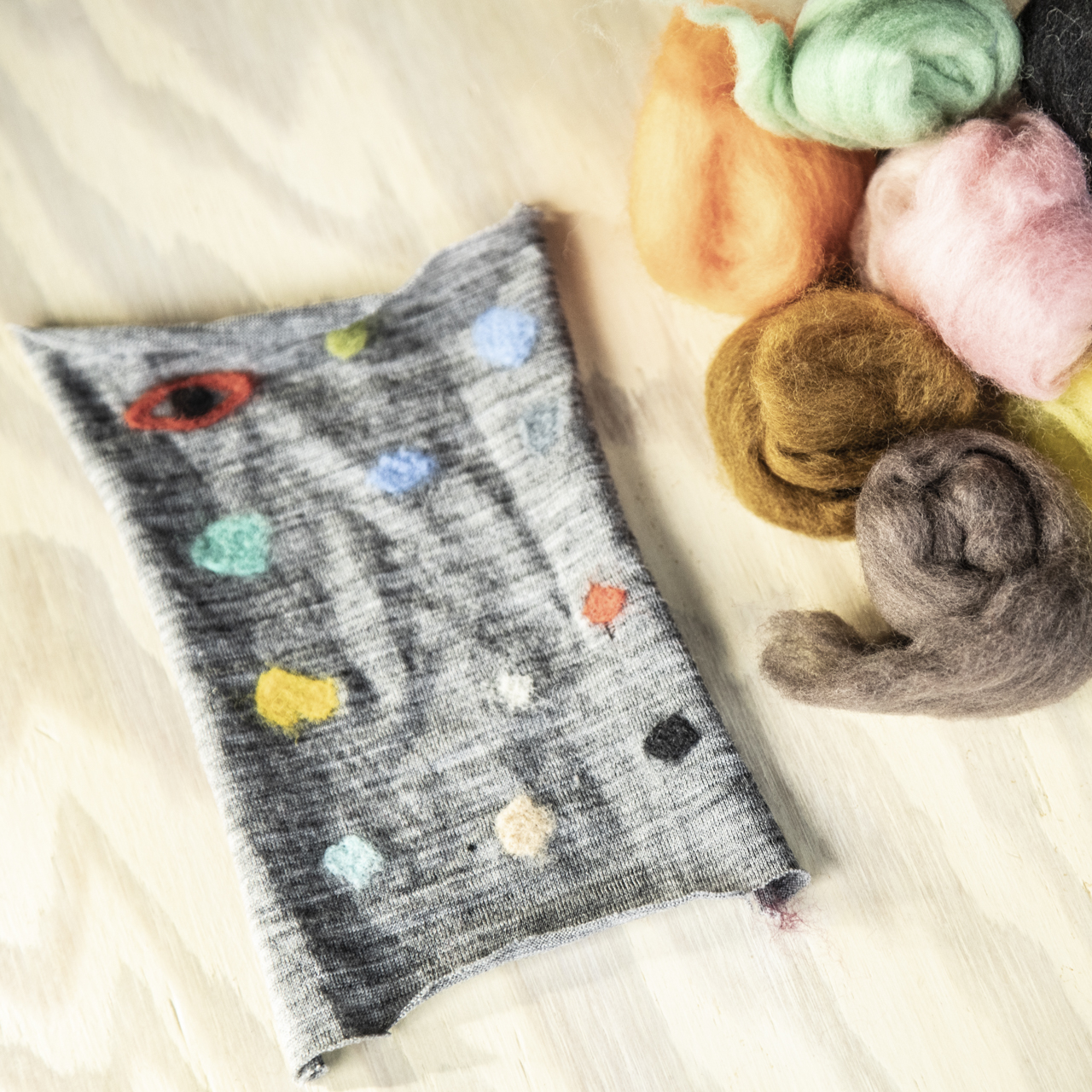 フェルティングの技法を使い、刺繍のようにワンポイントを入れたり、ウールニット製品の穴あき補修なども簡単に行えます。
