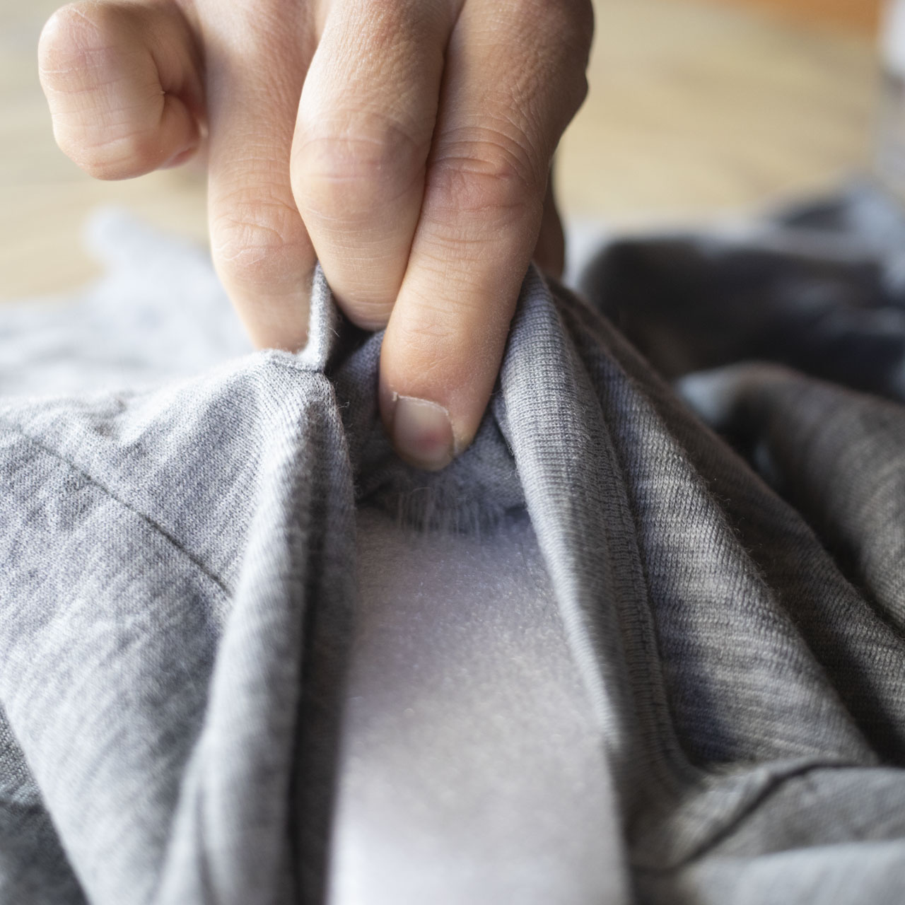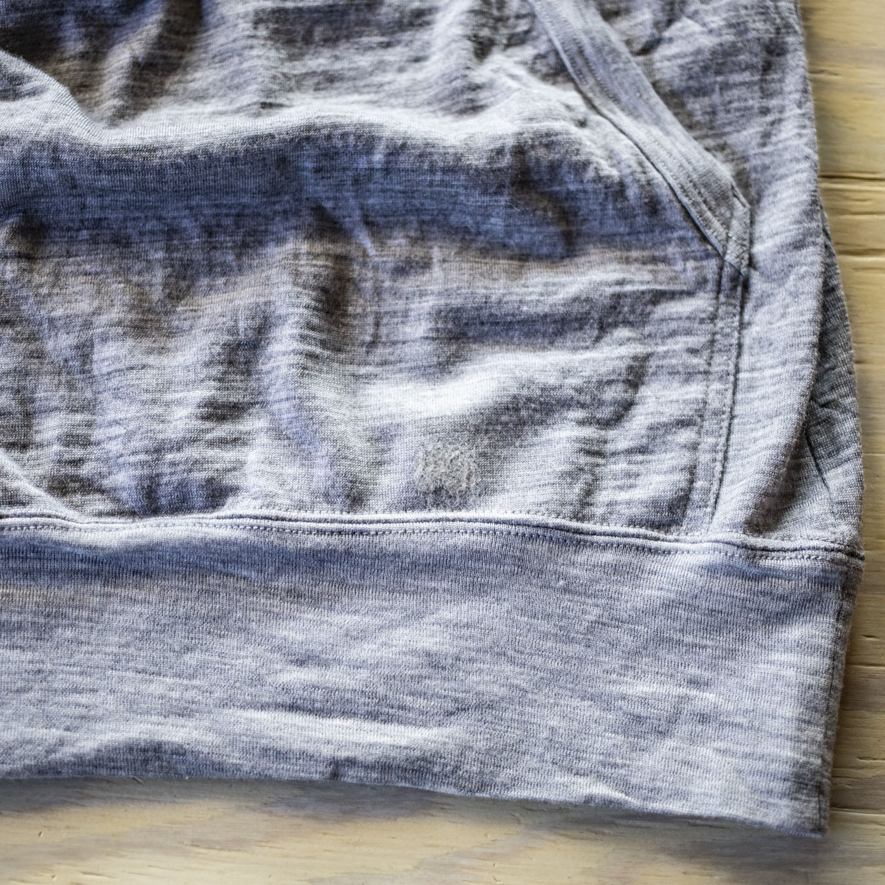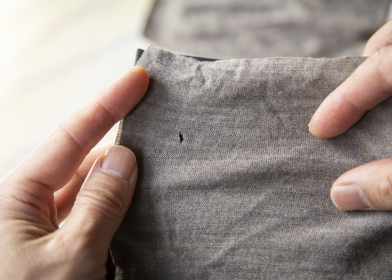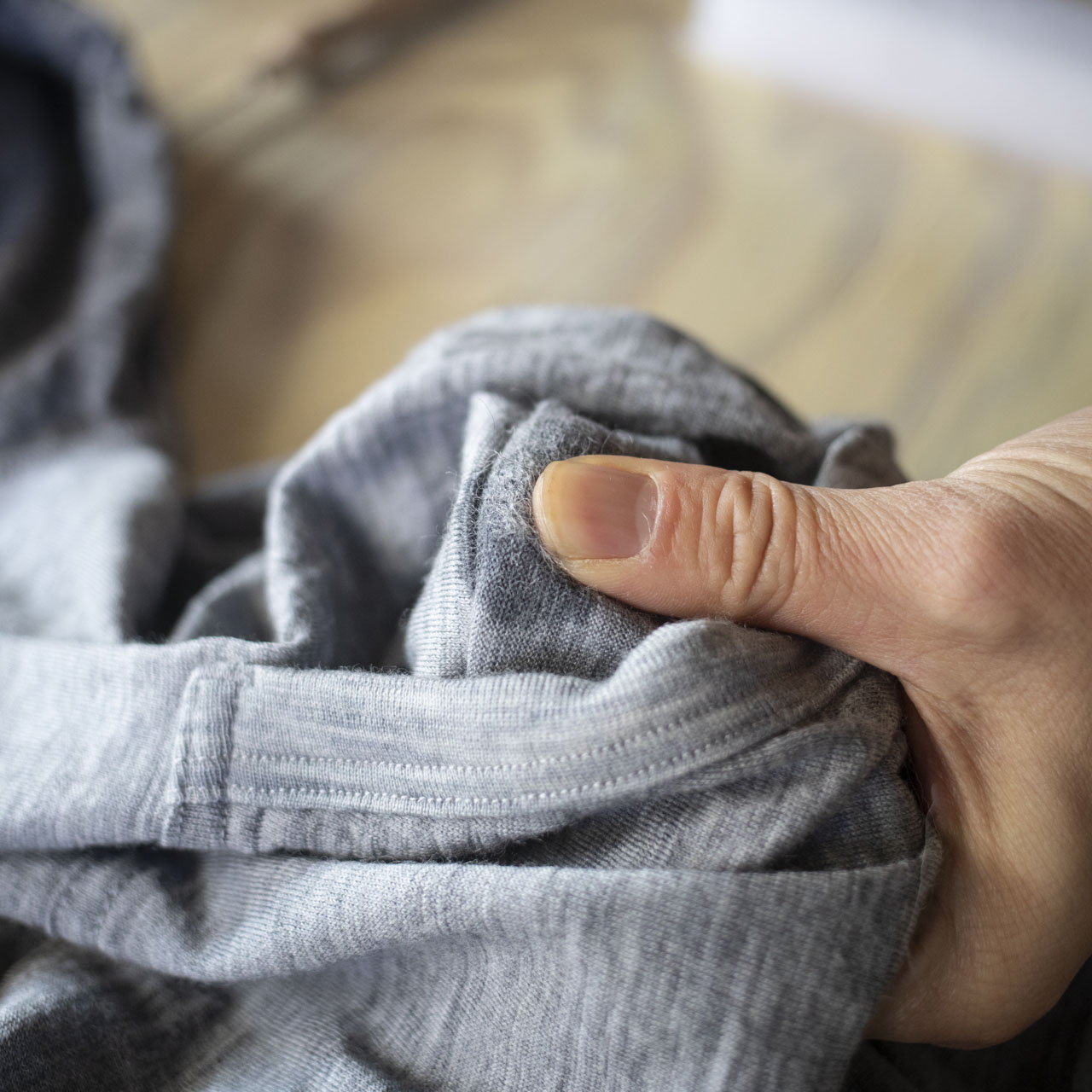 最近、よくお客さまから問い合わせをいただくことのひとつに、カットソーのメリノウール製品の穴あきがあります。天然繊維であるメリノウールは優れた調温・調湿機能や消臭機能など素晴らしい特性を持ちますが、虫食いや摩耗などで糸が切れ、穴があきやすいという弱点を持っています。