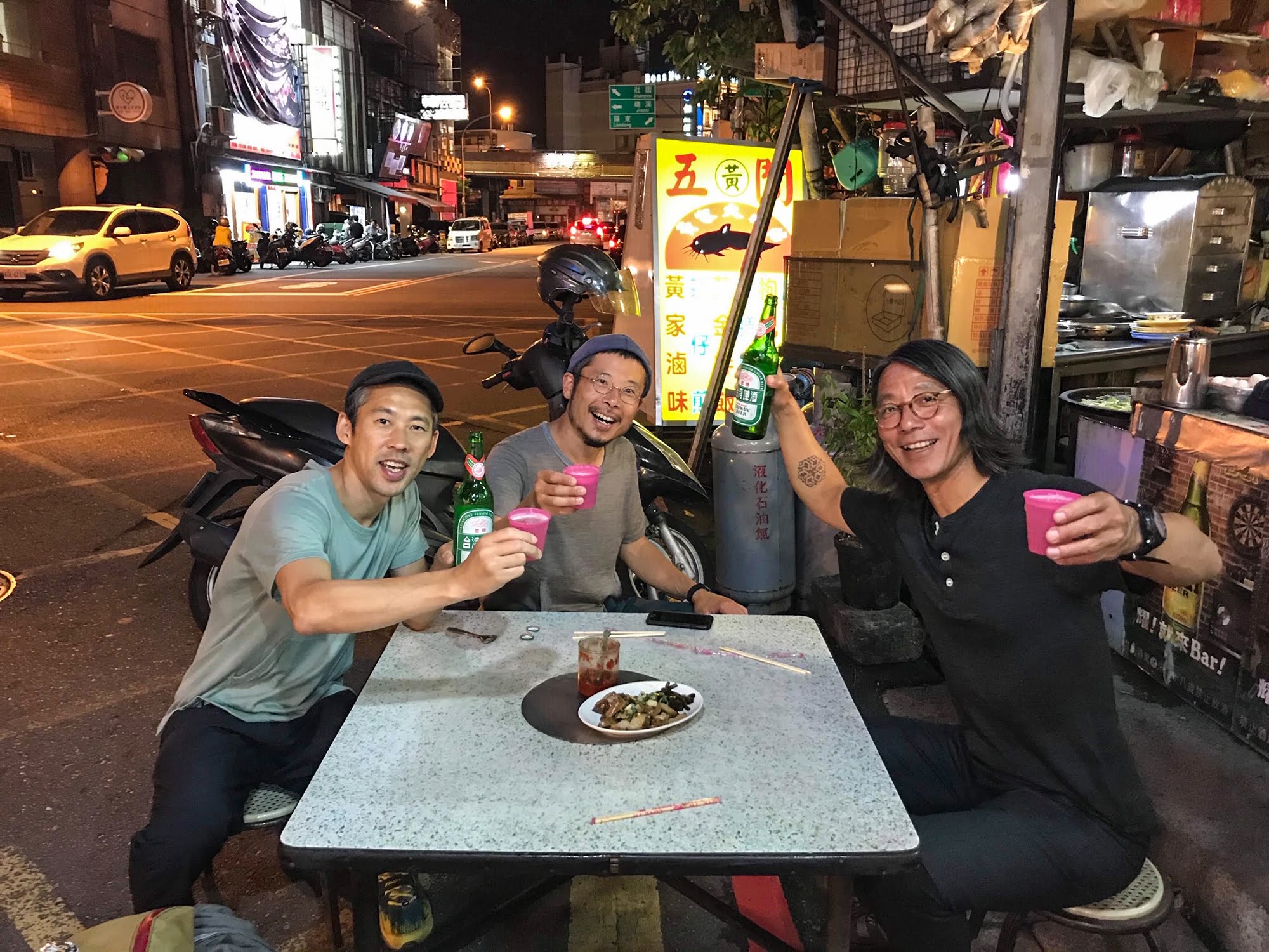 旅の準備を終わらせて宜蘭で旅の始まりを祝し乾杯。左よりボマちゃん、筆者、ヒデキさん。