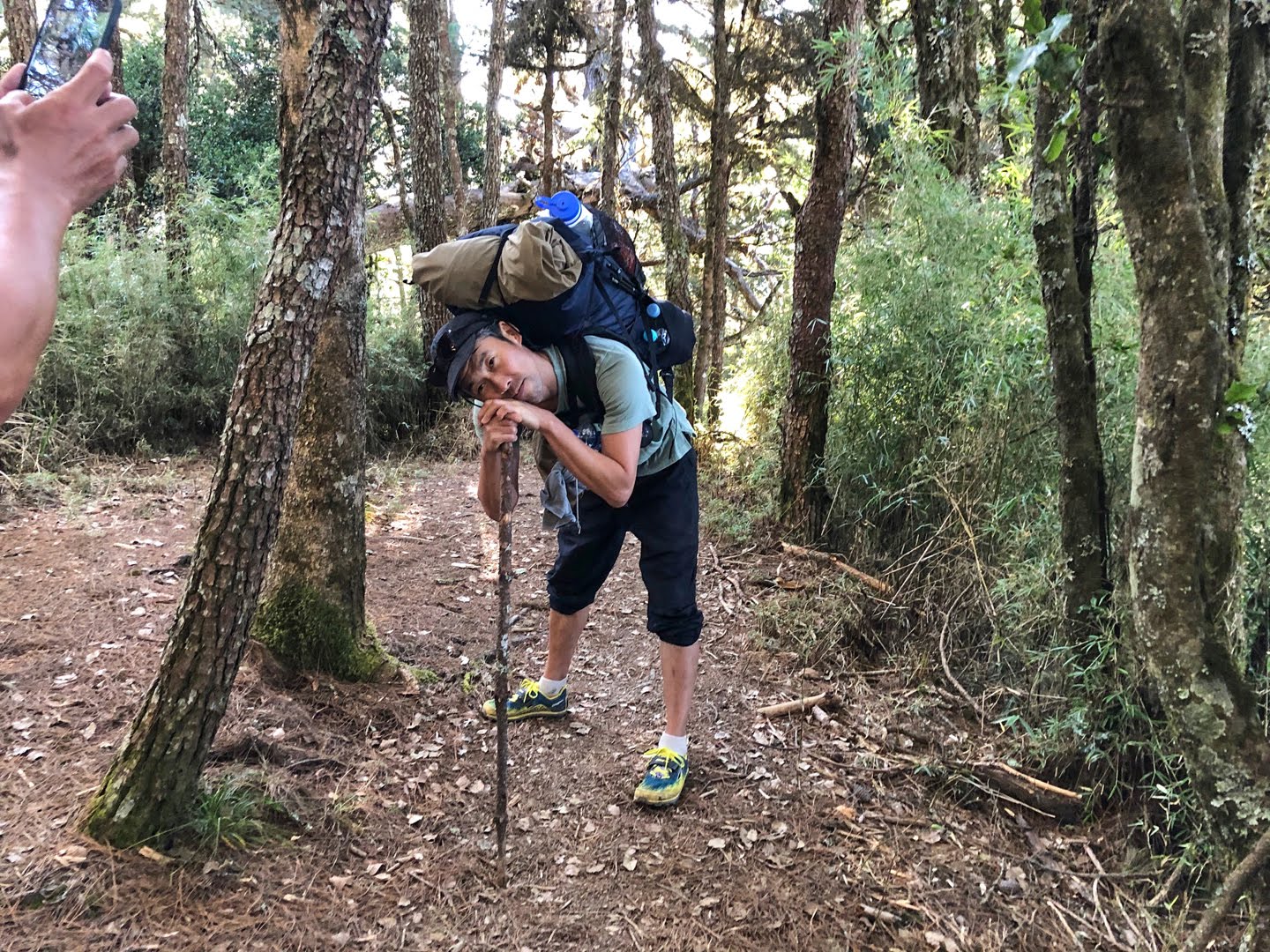 スイッチが切れてしまっている印象で、登り道で遅れがちなボマちゃんより少し後を行く。大丈夫かな、と思っていた矢先、倒木をくぐるタイミングで頭を強く打って「ギャフン!」と大きい声が出た。うっすら血も出て、しばらく悶絶していたかと思うと、文字通りスイッチが入ったようにバリバリと歩きはじめた。ツッコミどころがありすぎる。この3人の旅にネタは尽きない。