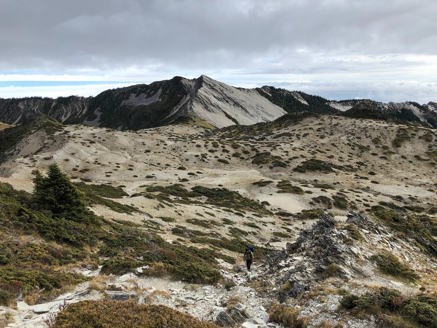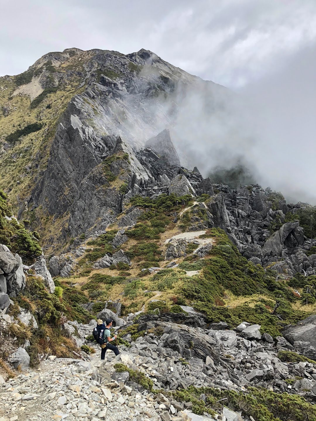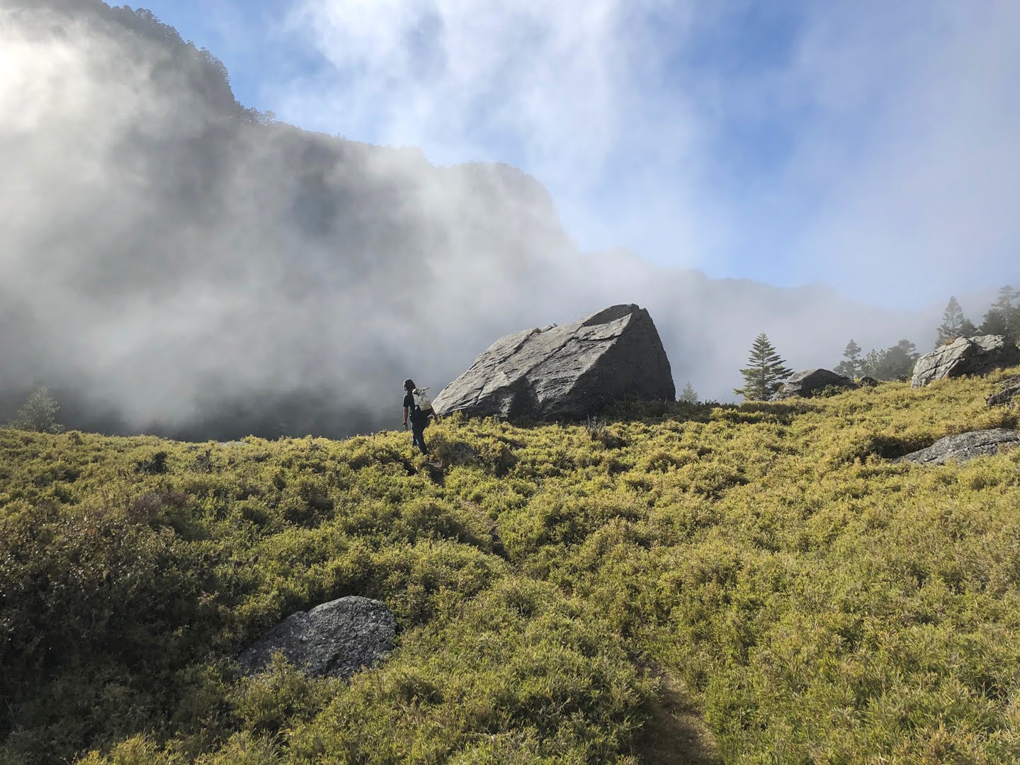 7時30分には南湖北山(3536m)に到着。昨日から続いている大雲海の光景にも慣れてきていたが、このあたりから台湾の山のスケールが明るみになり始め、心が踊った。日本で置き換えるならば南湖連峰は穂高連峰、数日後に行く予定の中央尖山は槍ヶ岳と言った具合で、僕たちはいままさに涸沢カールに差し掛かろうという展開なのである。