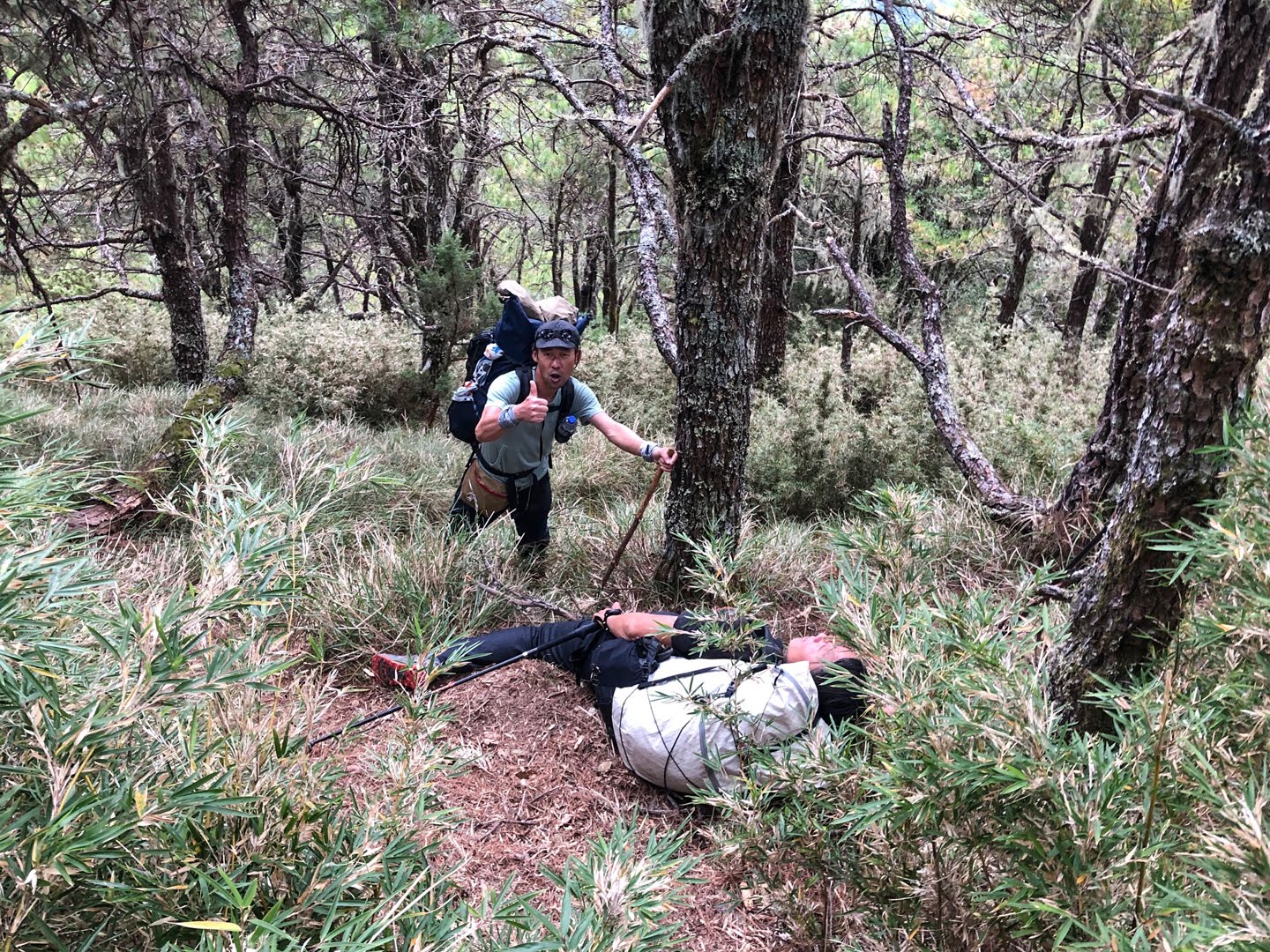 無補給6日分の荷に加えて、ビバーク用と翌日の行動のぶんの湧水も獲得して更にずっしり重くなったザックが堪え、ボマちゃんに疲れが見えはじめていた。雲稜山荘でいったん歩き終えたと思ったのに、また歩き始めたのも大きかったかもしれない。途中で拾った木の杖に寄っかかって、疲れを目で訴えかけてくる。