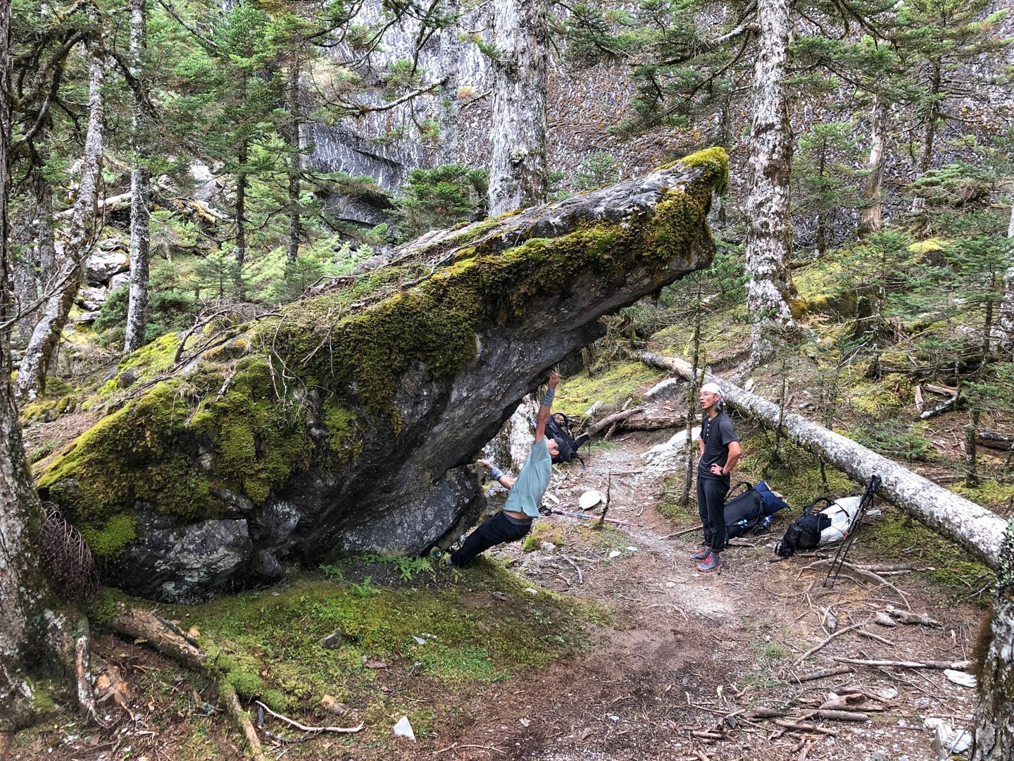 この辺りの山域は標高3400mを下回ったあたりから樹林帯が現れるらしく、巴巴山からの下りは樹林帯を抜けながらも、圧倒されるような奇岩が点在しており、クライマーでもあるヒデキさんやボマちゃんは楽しそうだった。