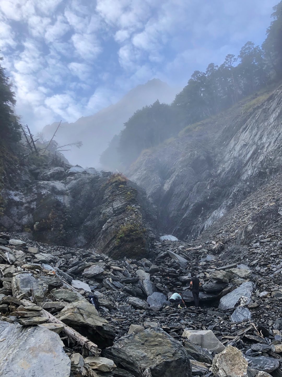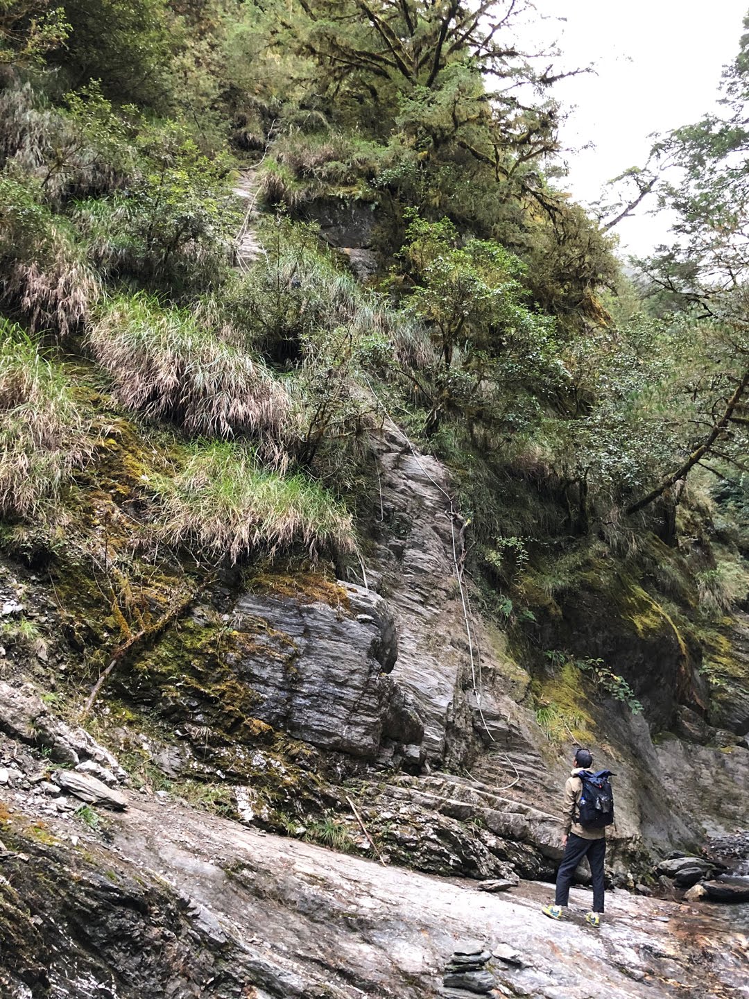 5時そこそこに出立し、沢沿いを上流につめると、15mはあろうかという高巻きの崖道に差し当たった。ロープこそ付いているが、ひとつの間違いで命の危険もある。昨朝のヘリコプターの画が頭をよぎる。おまけにこの日は出立から天気が悪かったので、足元が滑りやすいことにも少々不安があった。